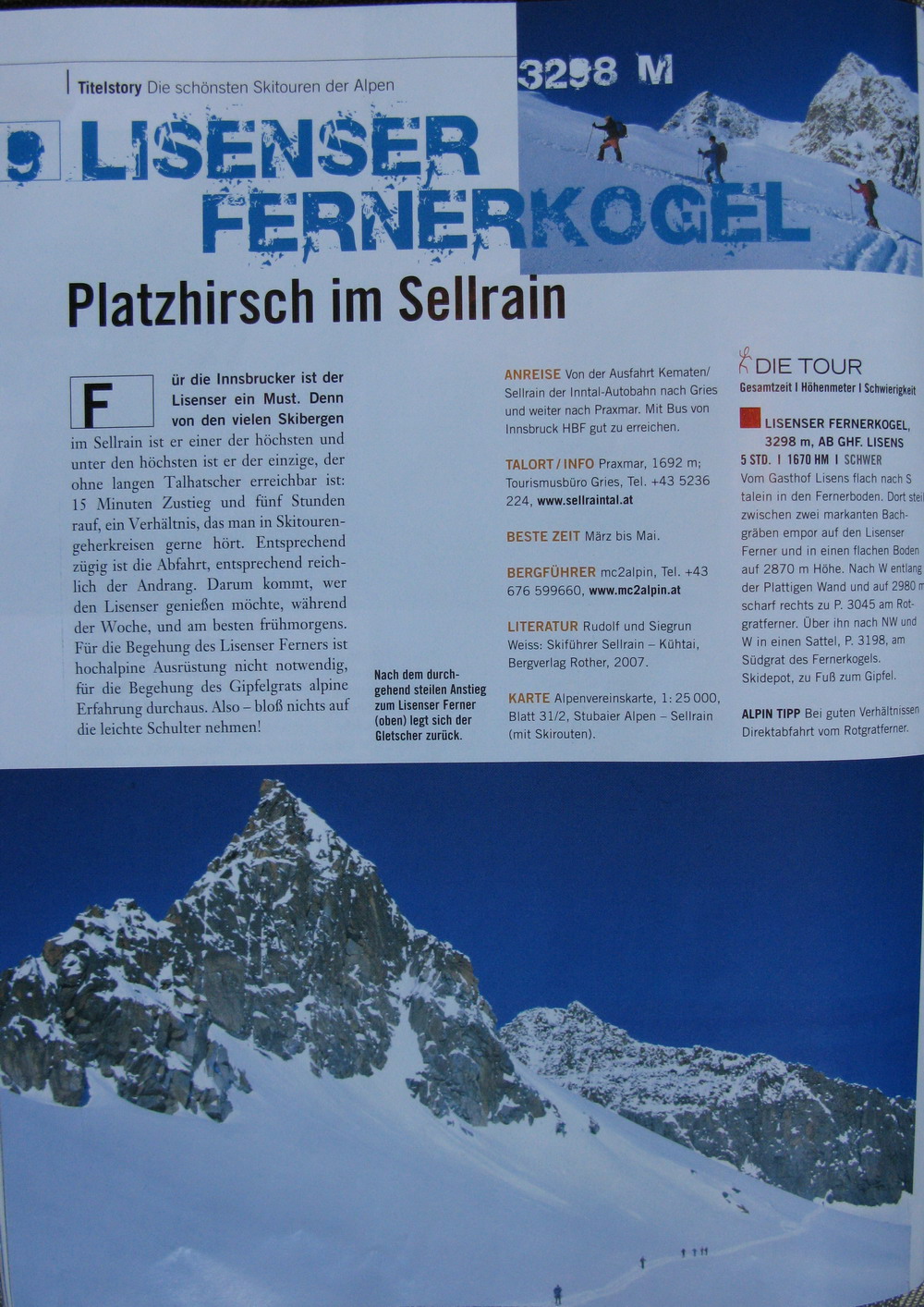 Pre skialpinistov z Innsbrucku je tento kopček povinnosťou. Žiaden iný v okolí, spomedzi tých vyšších a cennejšch nie je možné dosiahnuť bez dlhého sa trmácania dolinou. Pri výstupe na Lisenser Fernerkogel sa už po 15 minútach dolinou stopa začne pekne dvíhať a potom už na vás čaká 5 hodín makačky dokopca. Na prechod ľadovcom netreba brať žiadnu špeciálnu výstroj na zdolanie vrcholového hrebeňa však už skúsenosti mať treba.