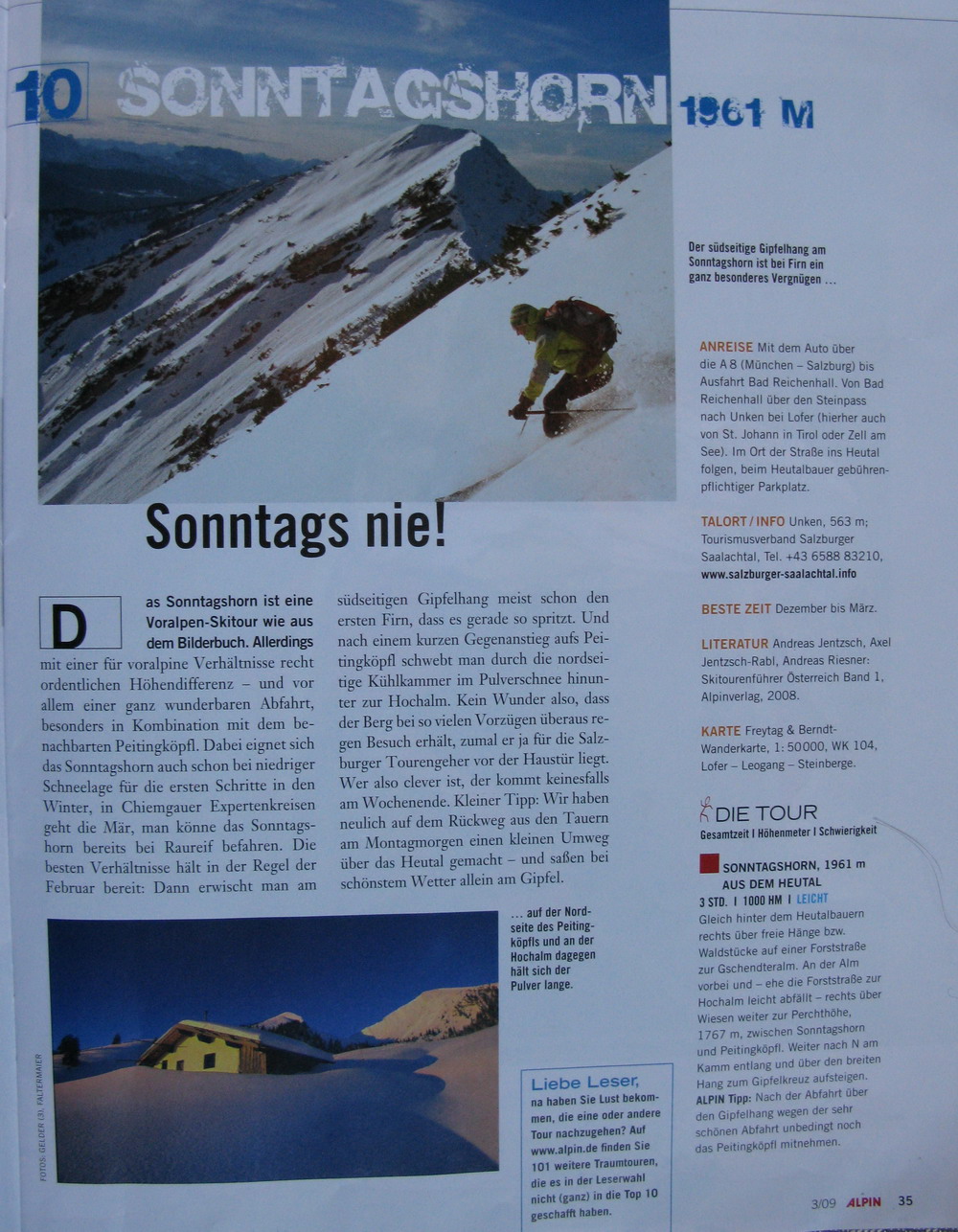 Desiatku najkrajších lyžiarskych túr uzatvoríme na pasienkoch. Sonntagshorn 1961m. je obľúbeným lyžiarskym kopčekom hlavne pre Salzburčanov. Hovorí sa, že táto túra sa dá spraviť už pri prvej námraze. Napriek nižšej nadmorskej výške na vás čaká prevýšenie 1000 metrov. Na túru sa odporúča vyraziť radšej cez týždeň ako cez víkend - ľahká dostupnosť. Túra sa odporúča spojiť s výstupom na Peitingköpfl.