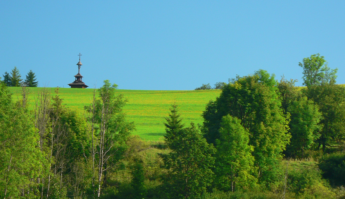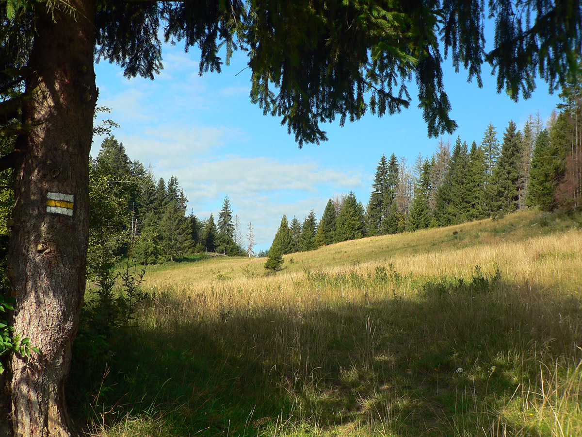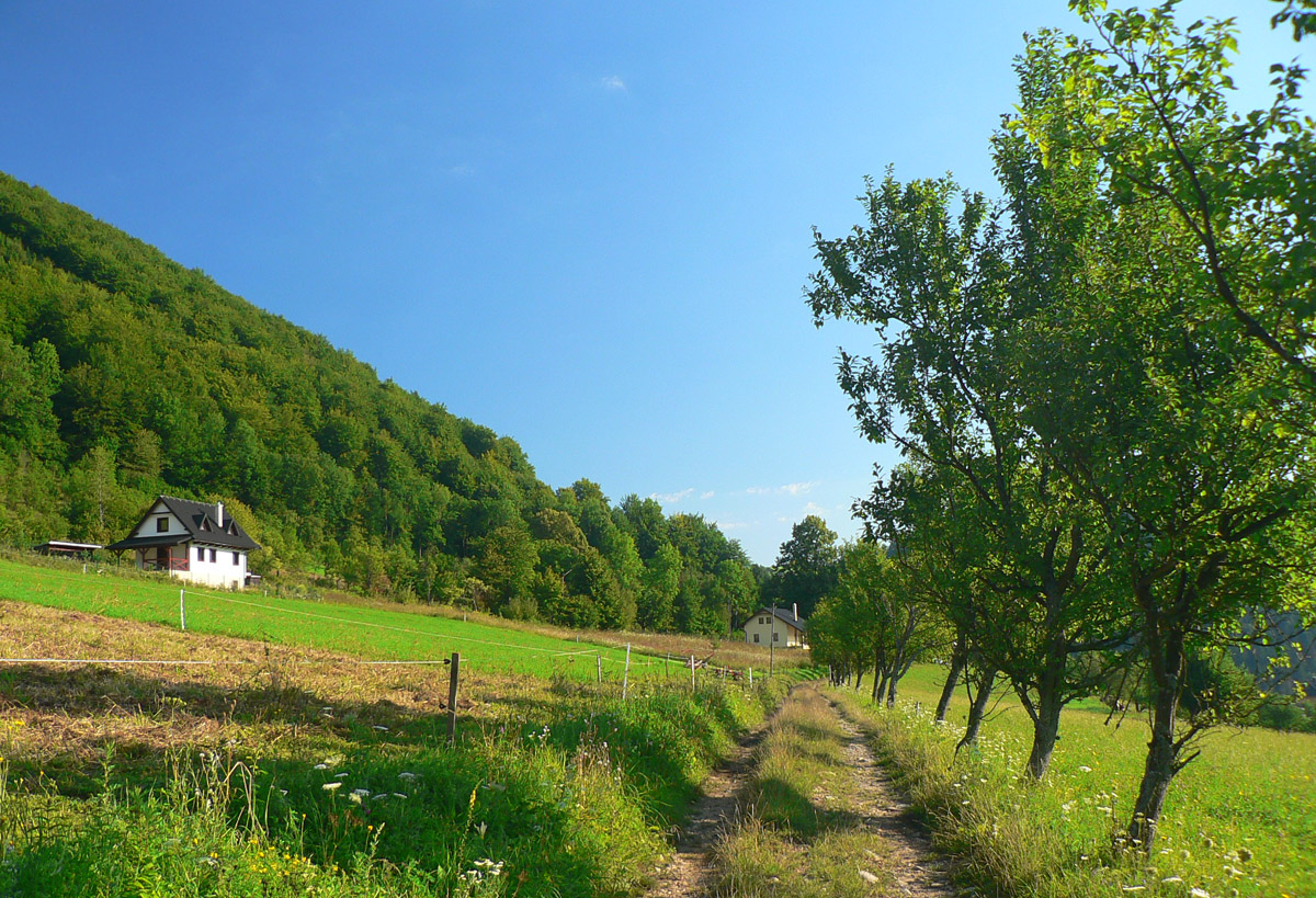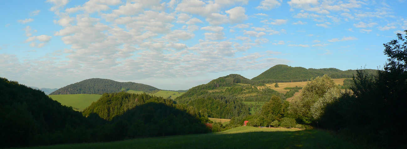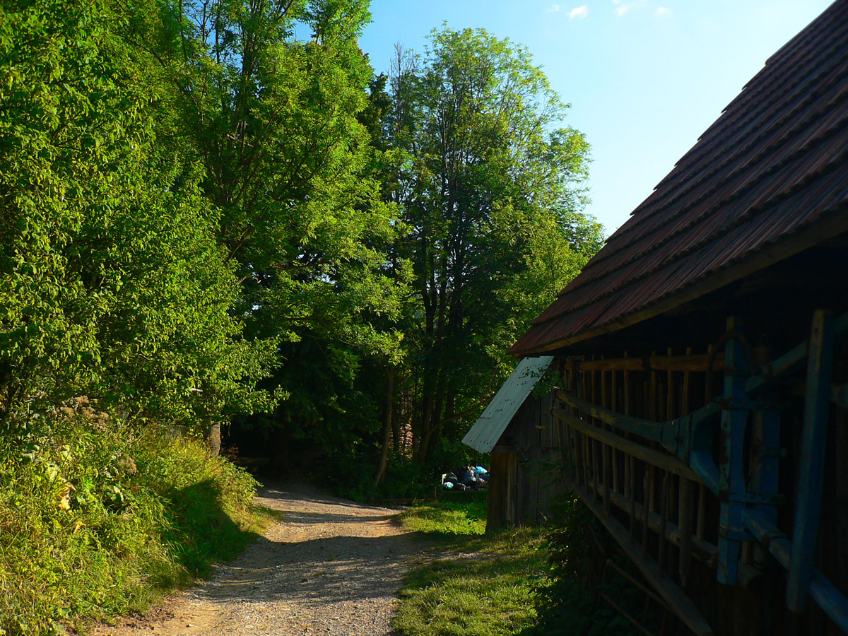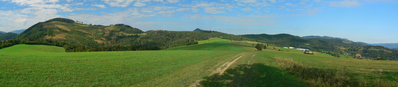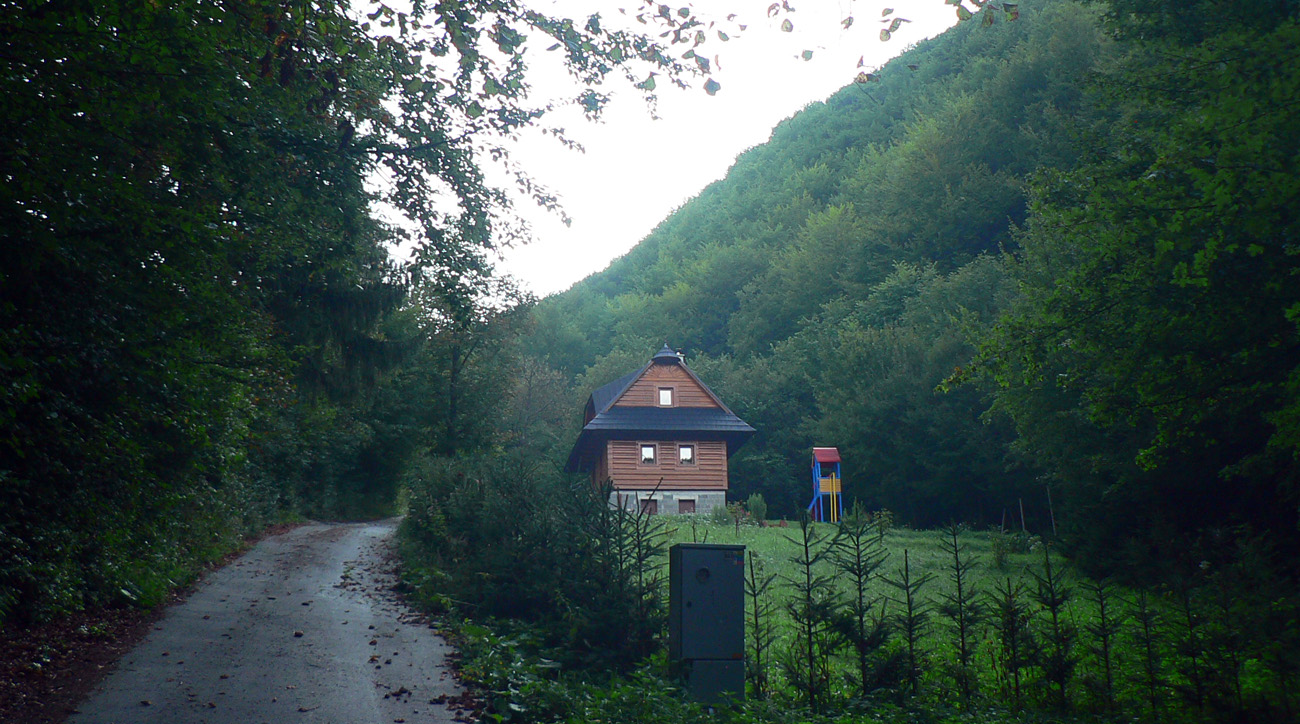 Takže na začiatok do Lysice po asfaltke a odtiaľ po žltej cez osadu Chabadovci. Len za dedinou, nad osadou Svetlov, treba bajk potlačiť, z cesty ostal hlboko erodovaný výmoľ. Ale už ho reparujú. Druhé krátke potlačenie nad osadou Ďurčovci – zas kombinácia strmého sklonu a erózie cesty. Potom už pohodová „hrebeňovka“, čiže široká cesta až do sedla Lutiška, so širokými výhľadmi z lúk.