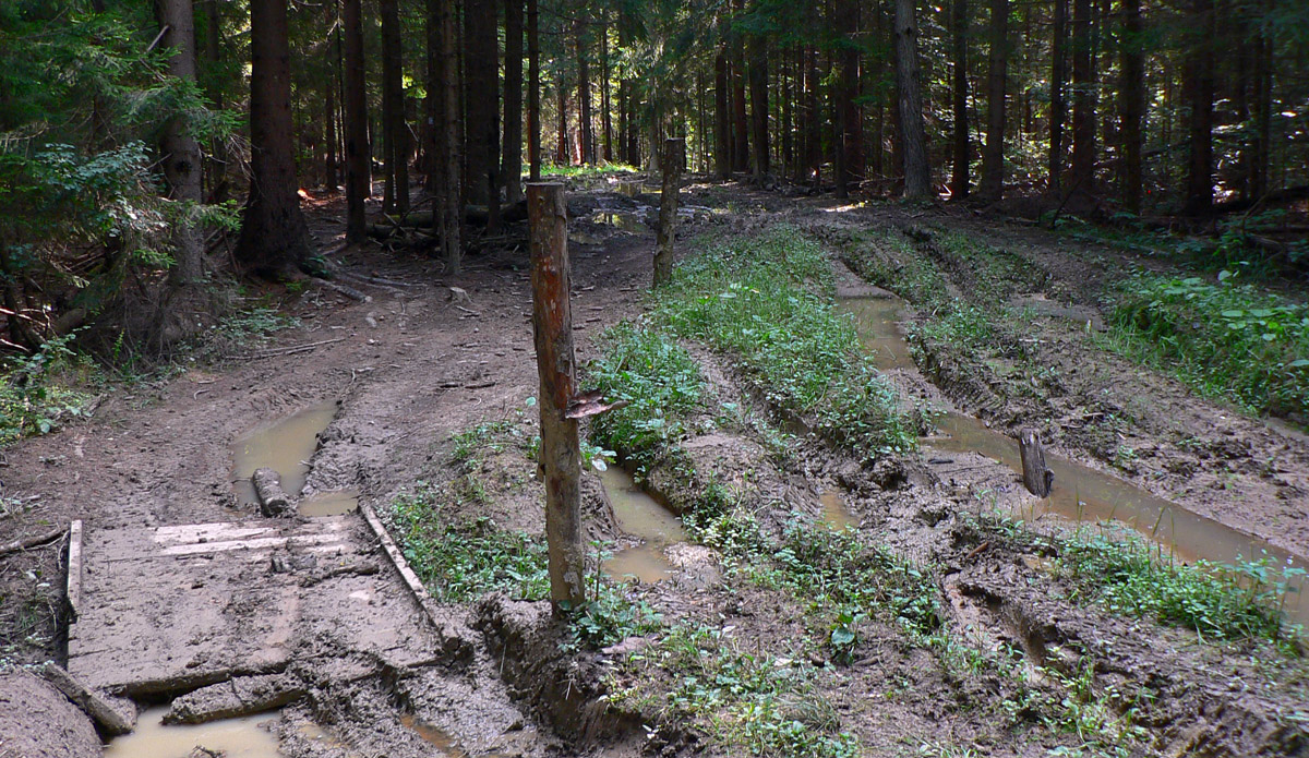 Zo sedla Lutiška sa ide hore po zelenej, po zvážnici vystlanej makadamom, asi dva kiláky a jedna serpentína, v pohode. Potom ale nasleduje tá spomínaná výnimka. V sedielku s križovatkou zvážnic značka aj cyklotrasa nenápadne odbočujú doprava dole, smer Vyšné Kamence, ale do poriadnej divočiny. Cesta tu je, ale dávno nepoužívaná, takže v lese popadané stromy, na čistinách krovie a žihľava vyše človeka. Nižšie rozbahnená cesta, niekedy ide aj priamo potokom, aj dole sa zle ide, nieto ešte hore. Ktorý inteligent toto ako cyklotrasu označil??? Bajkerom by som odporučil z toho sedielka pokračovať zvážnicou pod Mravečník a zostúpiť do Terchovej po modrej, alebo ešte zo sedla Lutiška to rubnúť po žltej ku Káčerovcom a stade dole do Tižinej.