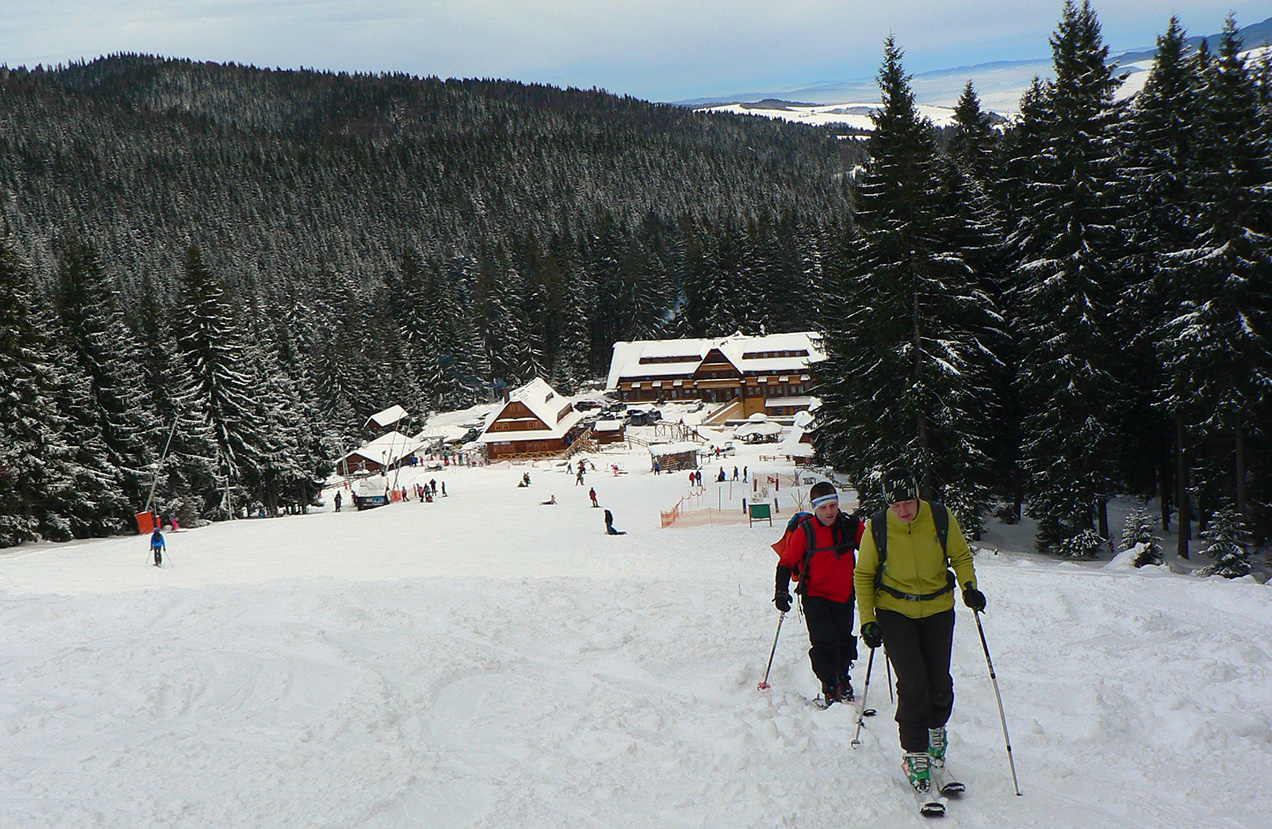 Lúky na Vasiľovskej holi sú po motorovom dementovi poorané tiež poriadne, ale naša stopa zachovaná, pred nami aj za nami ju dosť ľudí leští. A výhľady aj tu super, najmä na sever, kde Babia hora schováva hlavu v mrakoch. O chvíľu sme pri vleku a o ďalšiu chvíľu už štrikujeme dole po zjazdovke. Na otočke drevená koliba, tučný kocúr, desiatové polievky a ide sa nazad. Pekne slušne po okraji pisty, popod les.