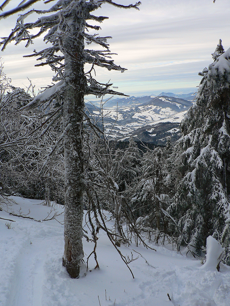 Sme hore, medzi Kubínskou hoľou a Minčolom – viditeľnosť ďaleká, aj keď pod mrakom. Nefúka, je to dnes paráda! Stopa do Príslopu viditeľná, ale dnes ešte nepreleštená. My ideme opačne. Pekne po modrej na Vasiľovskú hoľu a polyžovať dole k polievke. Hrebeňová lúka pod Minčolom (tráva ešte trčí) a prvý zošup lesom - je krátky, tak na rozcvičenie. Snehu dosť aj na brzdenie pluhom.