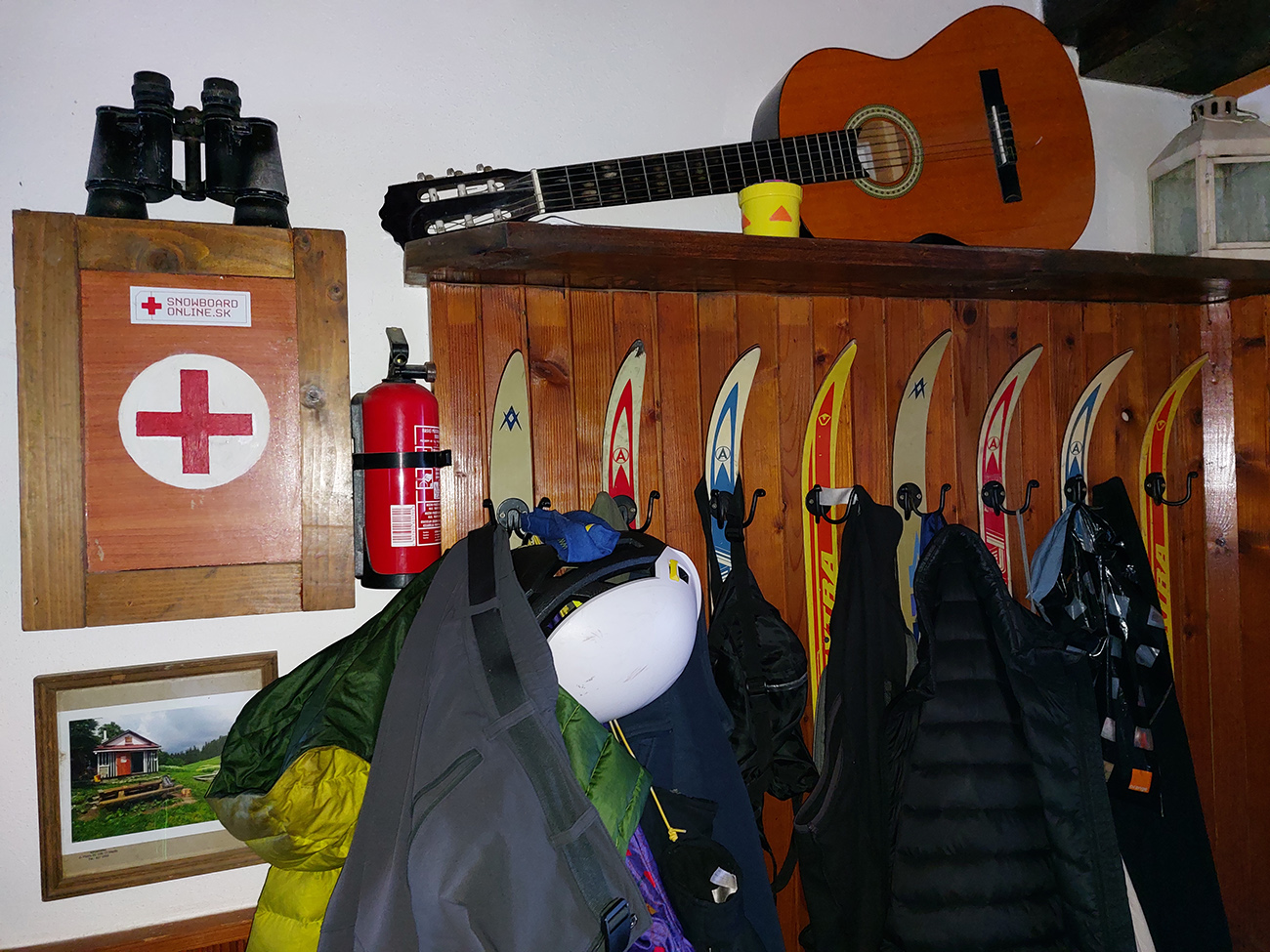 Vo vnútri je útulne (ako inak, že?): za malou predsienkou jediná miestnosť s pieckou, kuchynkou, stolom, lavicou a poschodovou posteľou. Tak pre 5 – 6 ľudí, ak sa na noc rozložia aj po zemi. Rebrík na horné poschodie postele bol zároveň rebríkom na povalu - to na starších fotkách. Na novších už vidno festovnejšie schodisko pri vchode. Hore na matracoch nájde nocľah ďalších osem ľudí (ale aj 14 tam už vraj spalo). Keby sa niekto ozaj už nezmestil, jeden tajný tip: o kus ďalej, takú pol hodinku peši, je na začiatku žlto značeného traverzu Kozieho chrbta, len pár stoviek metrov od sedla Hadľanka, hneď pod chodníkom, drevená búda, do ktorej síce trochu fučí, ale dá sa zavrieť a je tam stôl aj pričňa.