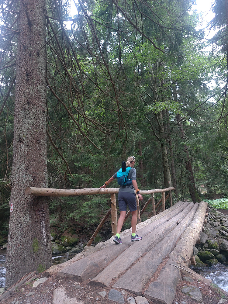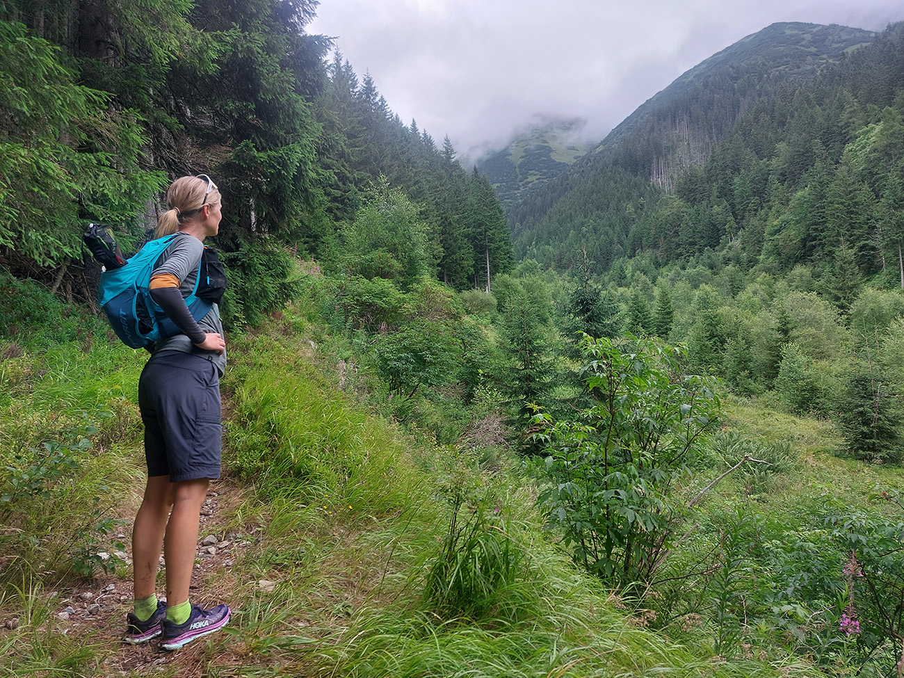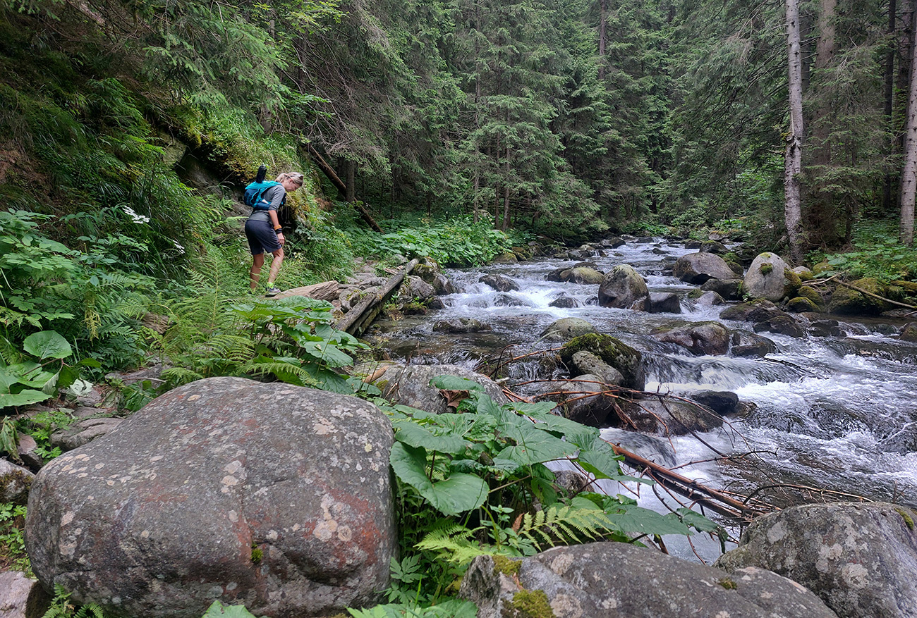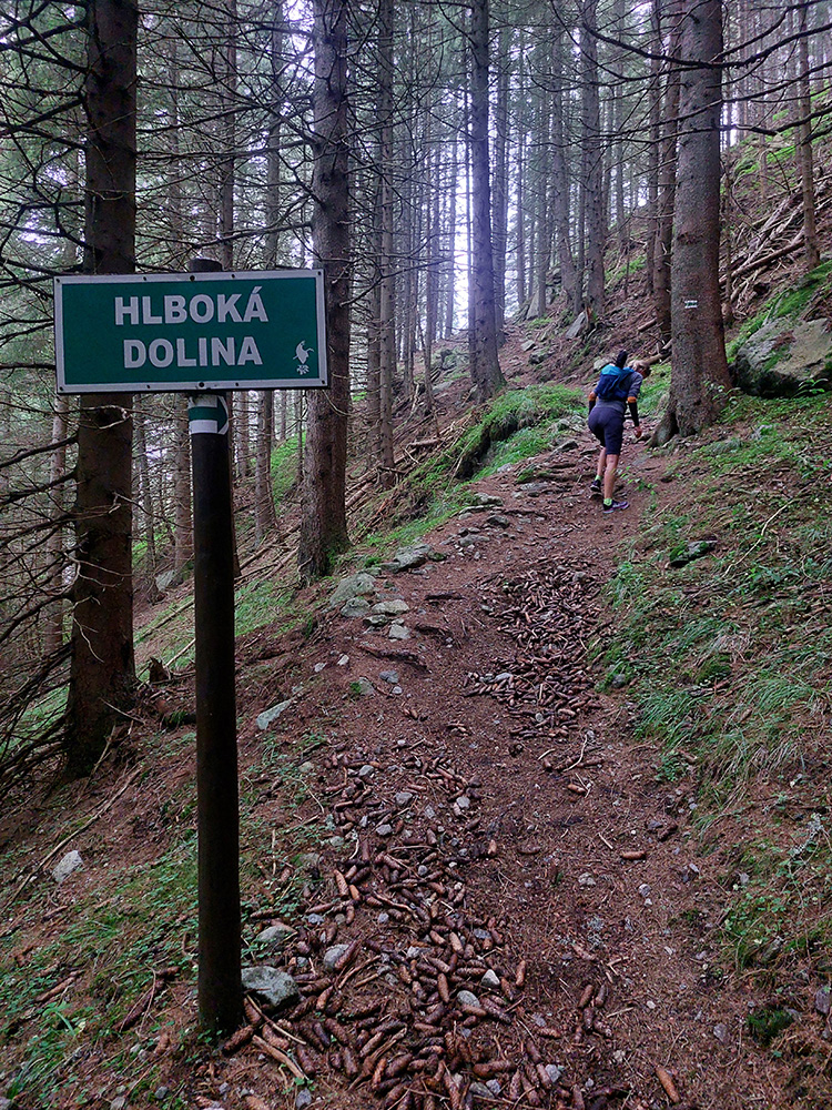 Nástup do Hlbokej vedie vysoko :-) Lebo tentokrát nie popri potoku, ale hneď od rázcestia strmo hore, do svahu nad dolinou. Potom znovu kalamitisko, teda aj čučoriedkové hody. Onedlho von z lesa do kosodreviny a zase bližšie ku potoku, cez ktorý treba občas preskočiť. Aj cez početné prameniská.