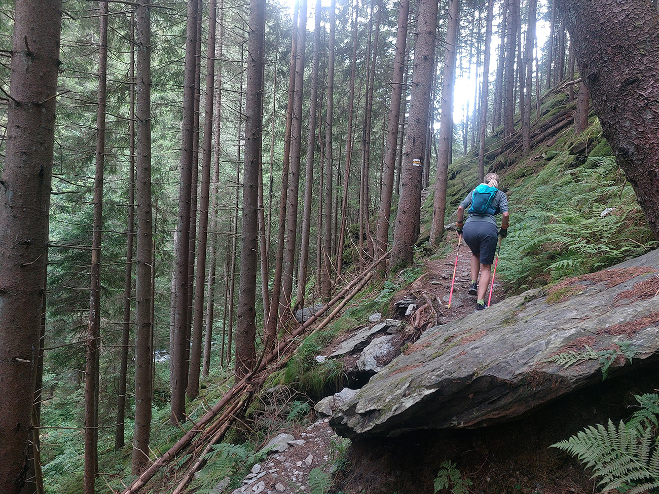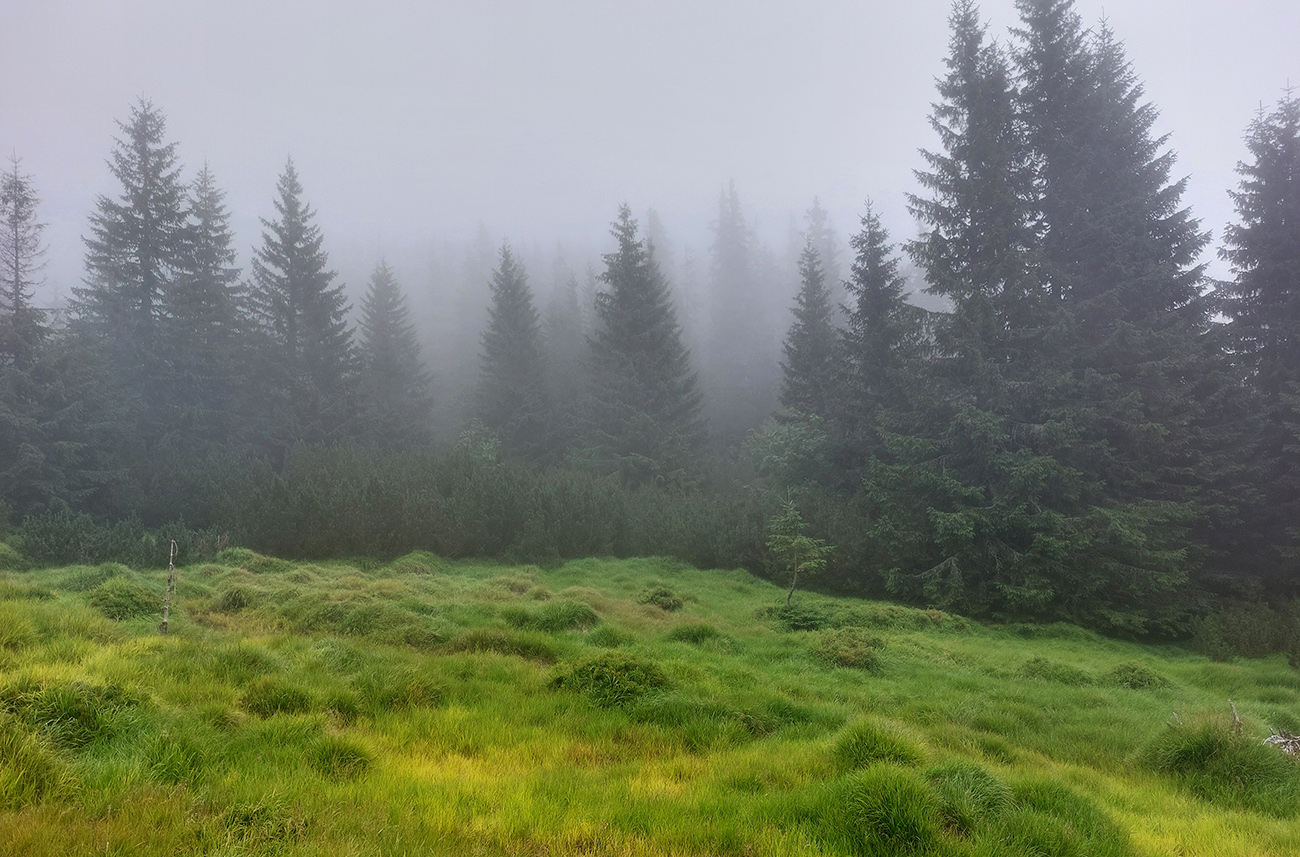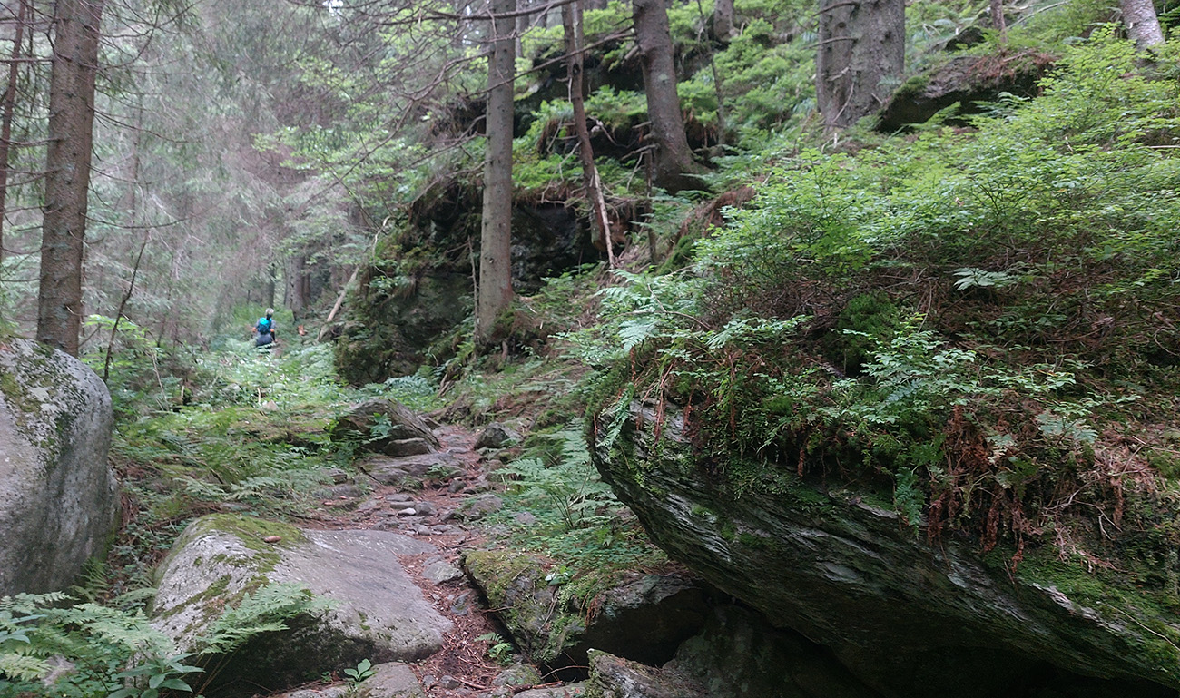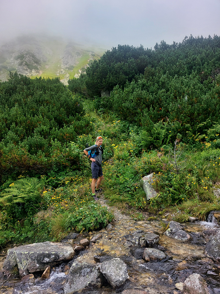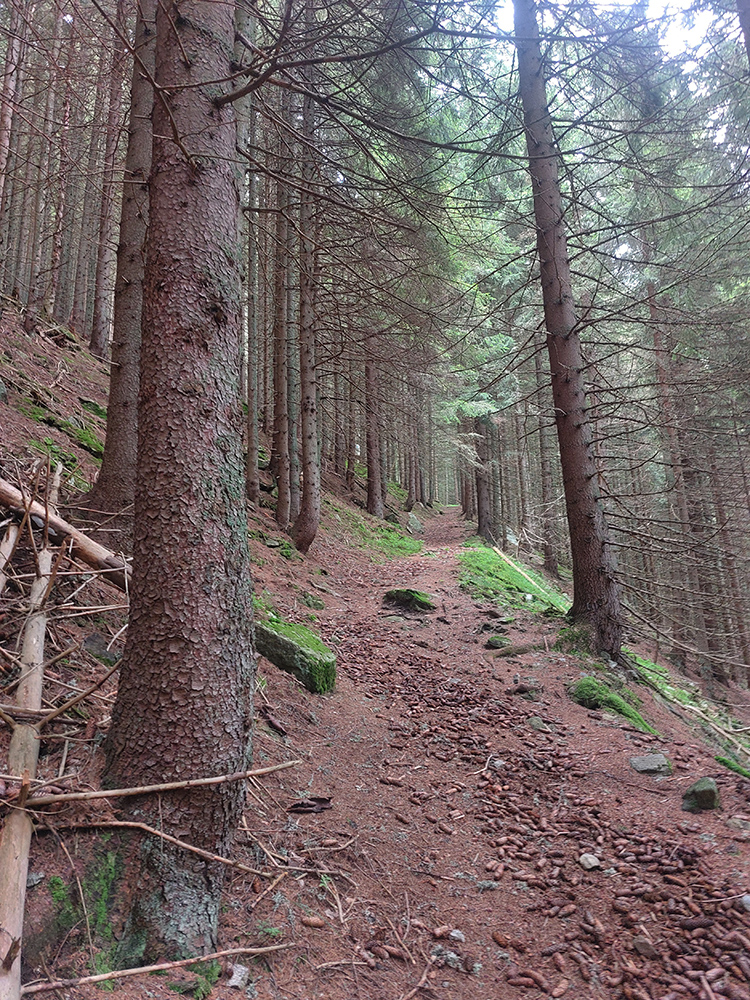 Ako začína les rednúť, na chodníku sú častejšie strmé „schody“ a okolo viac tráv a malinčia. Nám hustla aj hmla, takže pri Čiernom a Bielom plese sme nedovideli ani na ich koniec. Mokrí na nohách od trávy a vyššie od kosovky sme to otočili pod serpentínou záverečného výšvihu do sedla Pálenica.