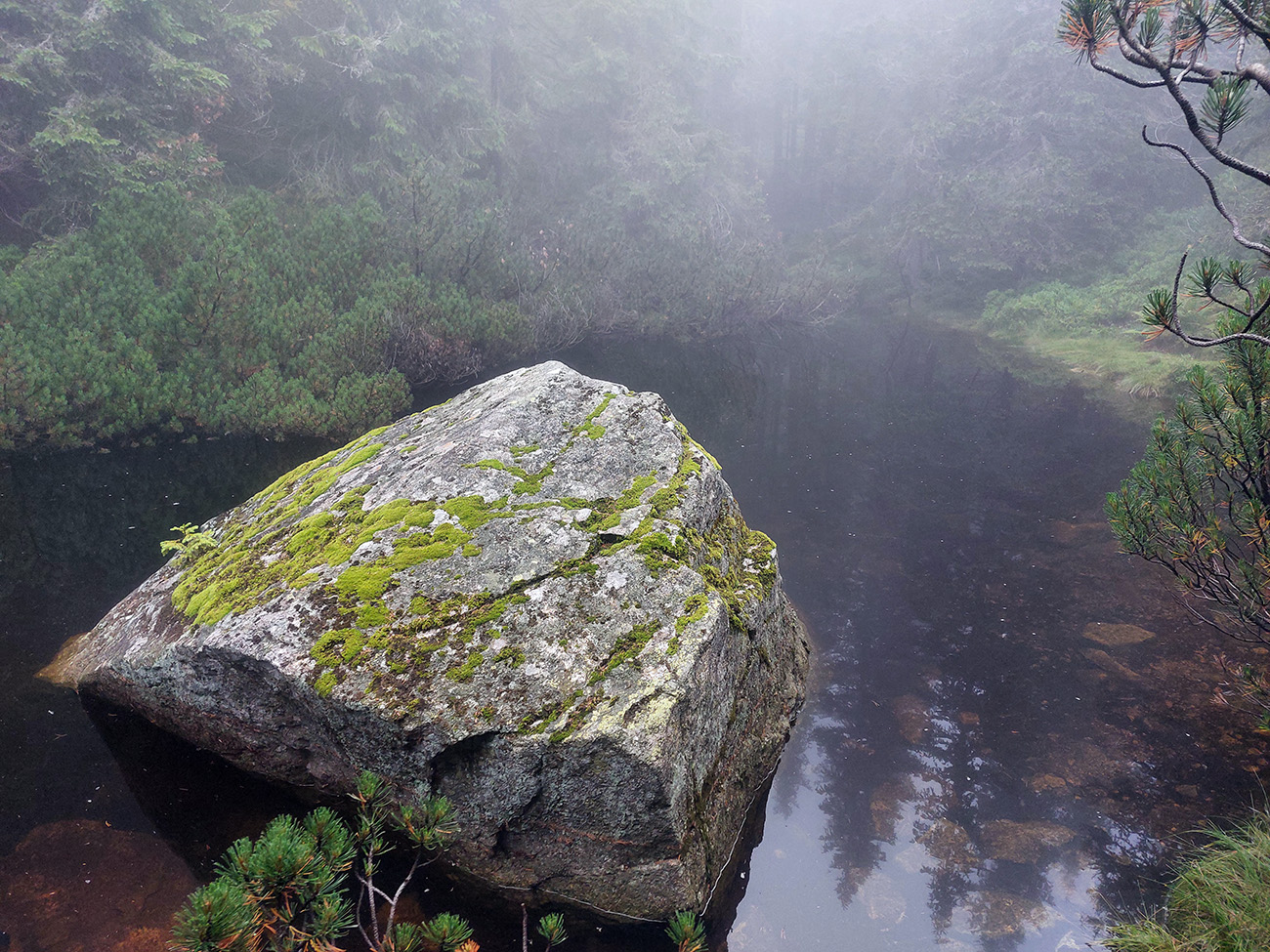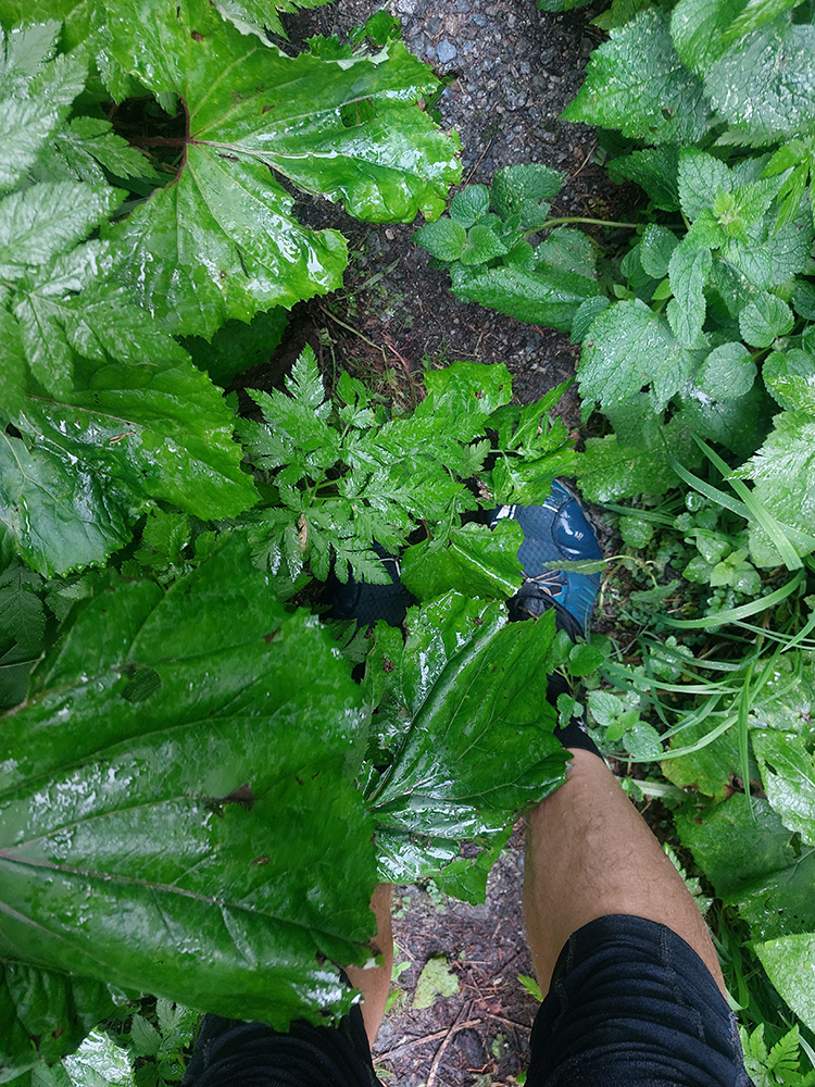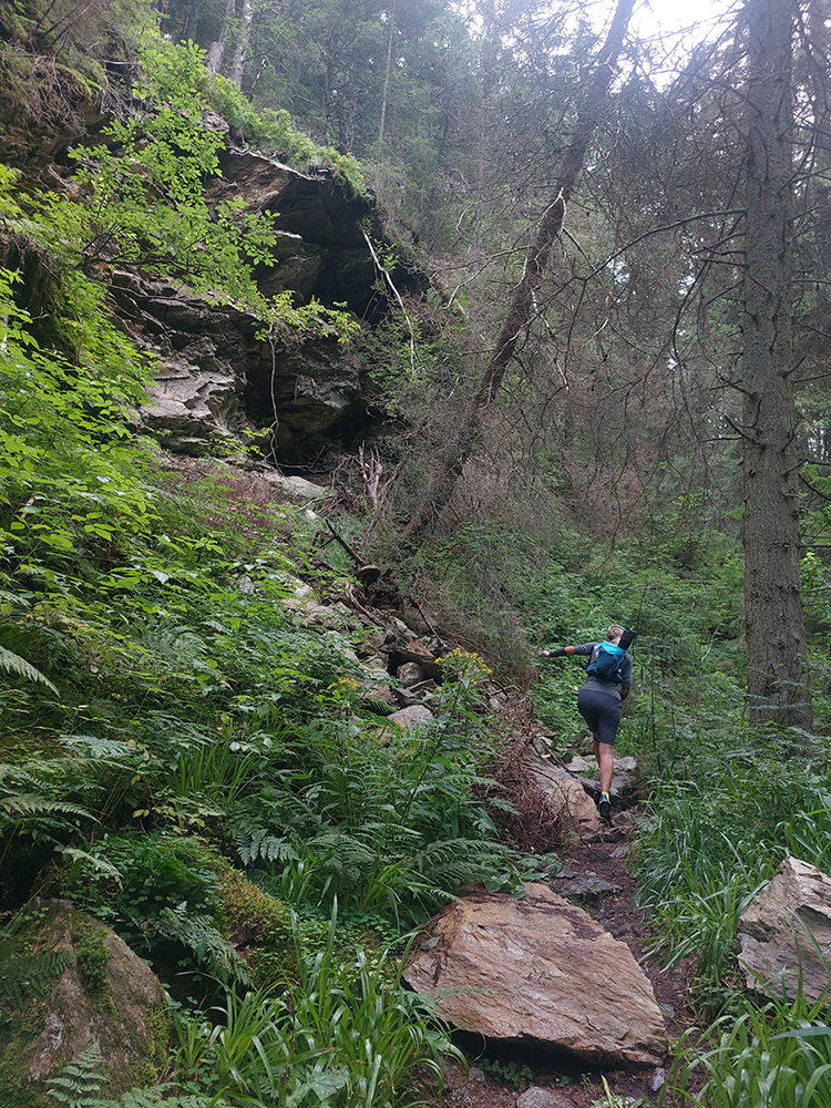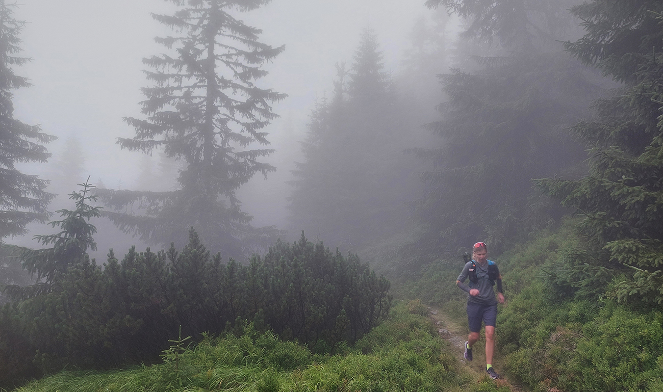Ako začína les rednúť, na chodníku sú častejšie strmé „schody“ a okolo viac tráv a malinčia. Nám hustla aj hmla, takže pri Čiernom a Bielom plese sme nedovideli ani na ich koniec. Mokrí na nohách od trávy a vyššie od kosovky sme to otočili pod serpentínou záverečného výšvihu do sedla Pálenica.