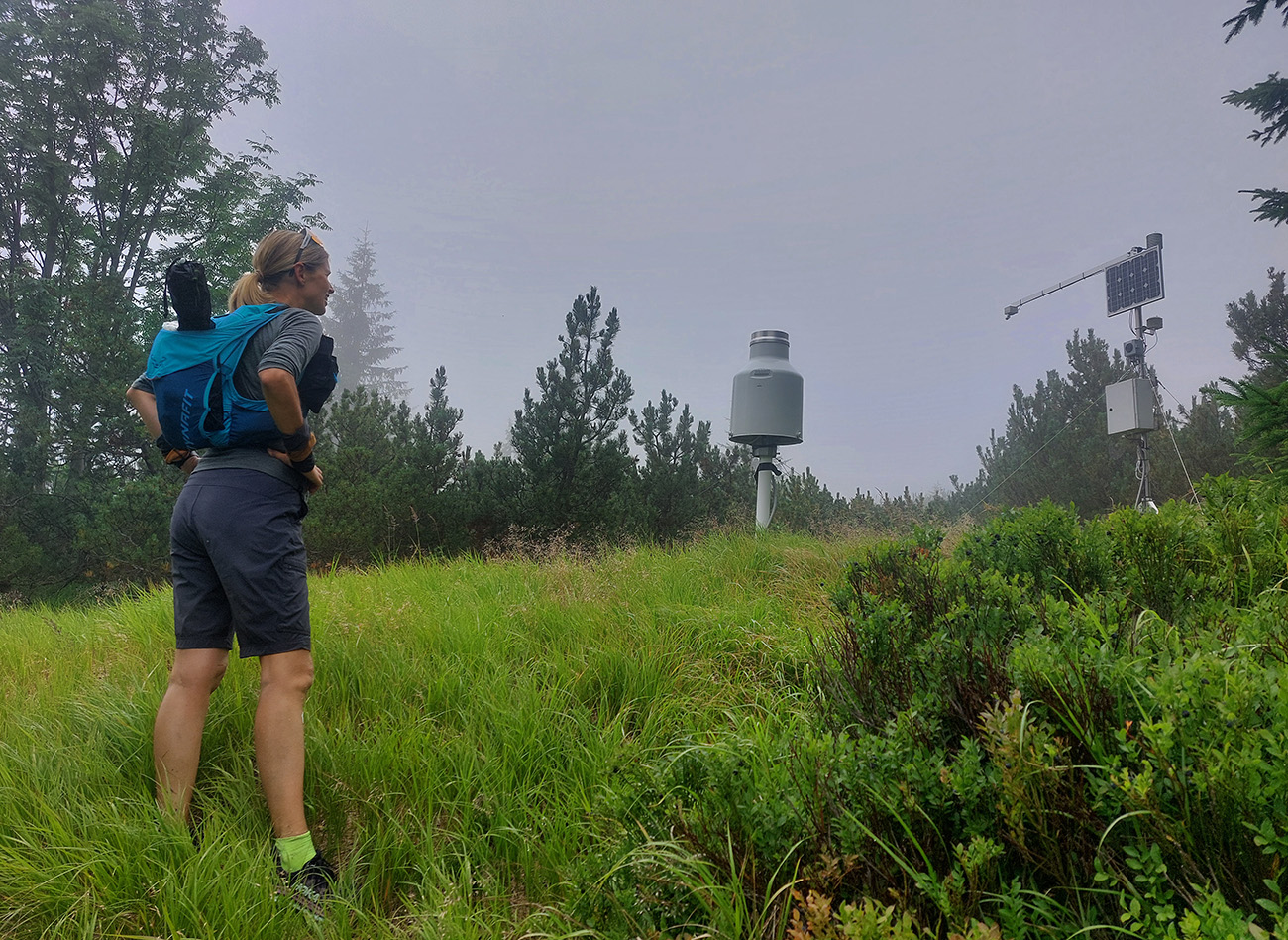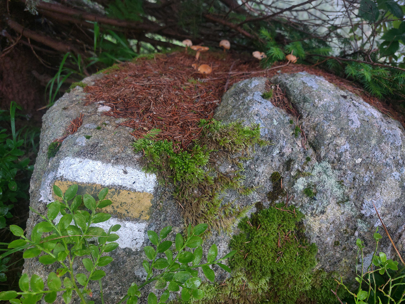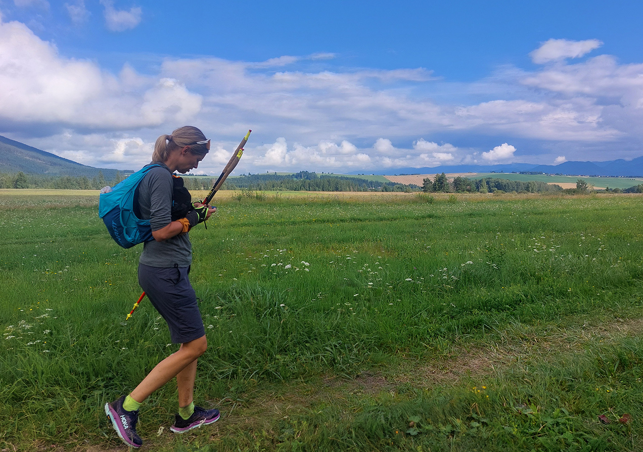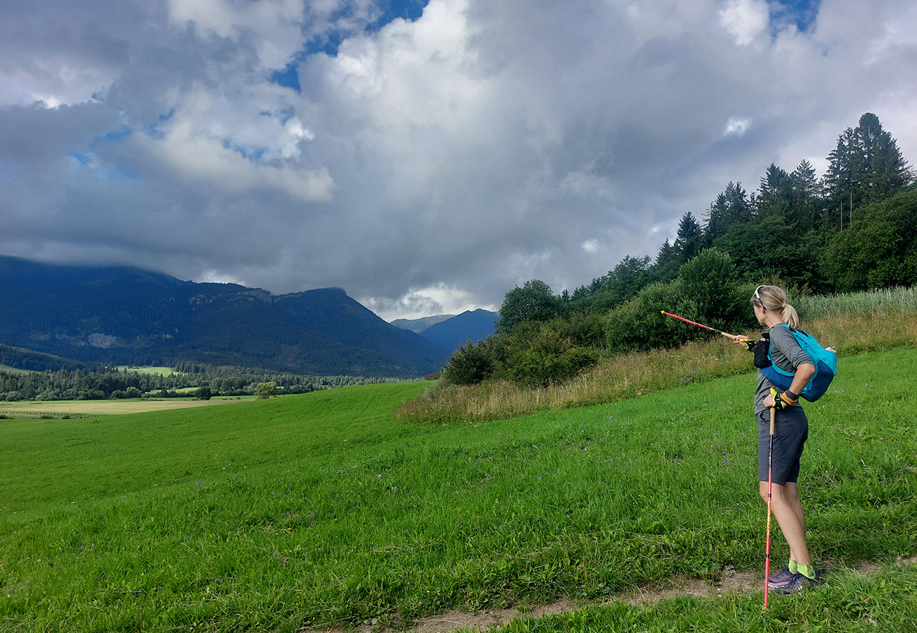 Ako začína les rednúť, na chodníku sú častejšie strmé „schody“ a okolo viac tráv a malinčia. Nám hustla aj hmla, takže pri Čiernom a Bielom plese sme nedovideli ani na ich koniec. Mokrí na nohách od trávy a vyššie od kosovky sme to otočili pod serpentínou záverečného výšvihu do sedla Pálenica.
