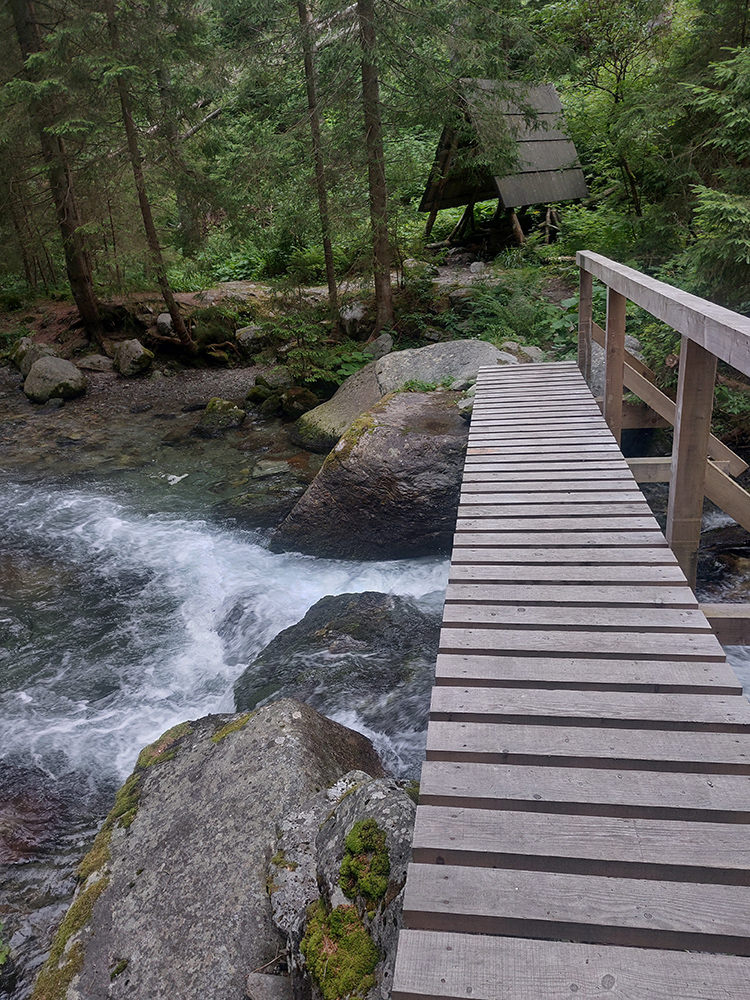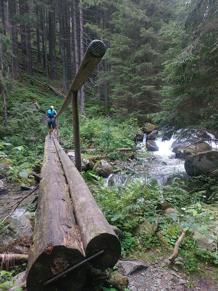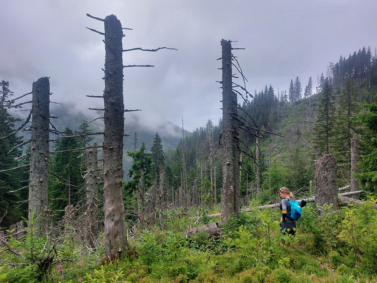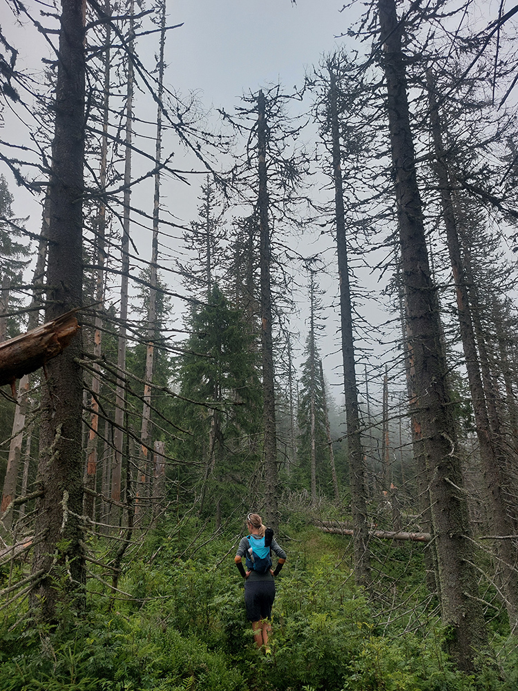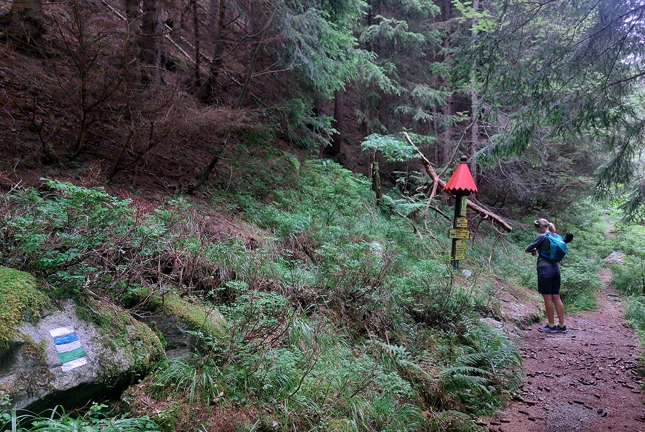 Na úvod teda busom do Jalovca a hybaj hore dedinou, potom pomedzi pasienky a lesom pomedzi chaty do ústia Jaloveckej. A tam to začína! Zatiaľ síce ešte len taká polodivočina na rozcvičku, lebo chodník upravený, mostíky nové, ale potok hučí a skáče, naokolo prales ako z filmu. Občasné priehľady na bralá, občas pohľad do vysušeného a zožratého kusa lesa, ktorý ale ako celok napriek kuvičím hlasom tomu chrobákovi akosi zázrakom odolal, že? Taká hodinka a pol nie veľmi strmého stúpania ku smerovníku na Rázcestí pod Lyscom, kde sa to začína vetviť.