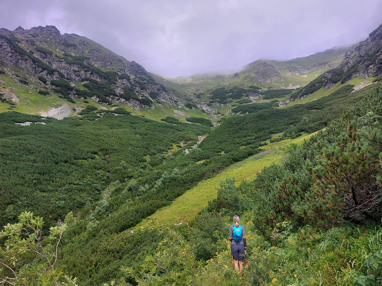 Keď aj kosovka ubudne, pribúda sklon a chodník smeruje do finálnej strminy pod Malým Salatínom. Nám sa už mraky trochu dvihli a poodhalili bralá vo svahu, ale toho zlostne syčiaceho kamzíka nad nami nie. Tak sme to za mrholenia znovu stočili nazad dolu, zrýchleným presunom do poslednej doliny.