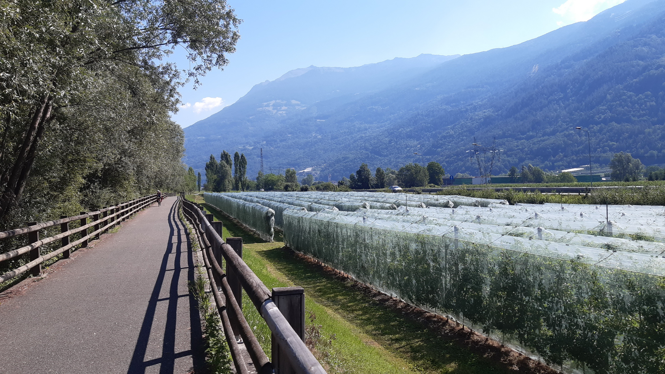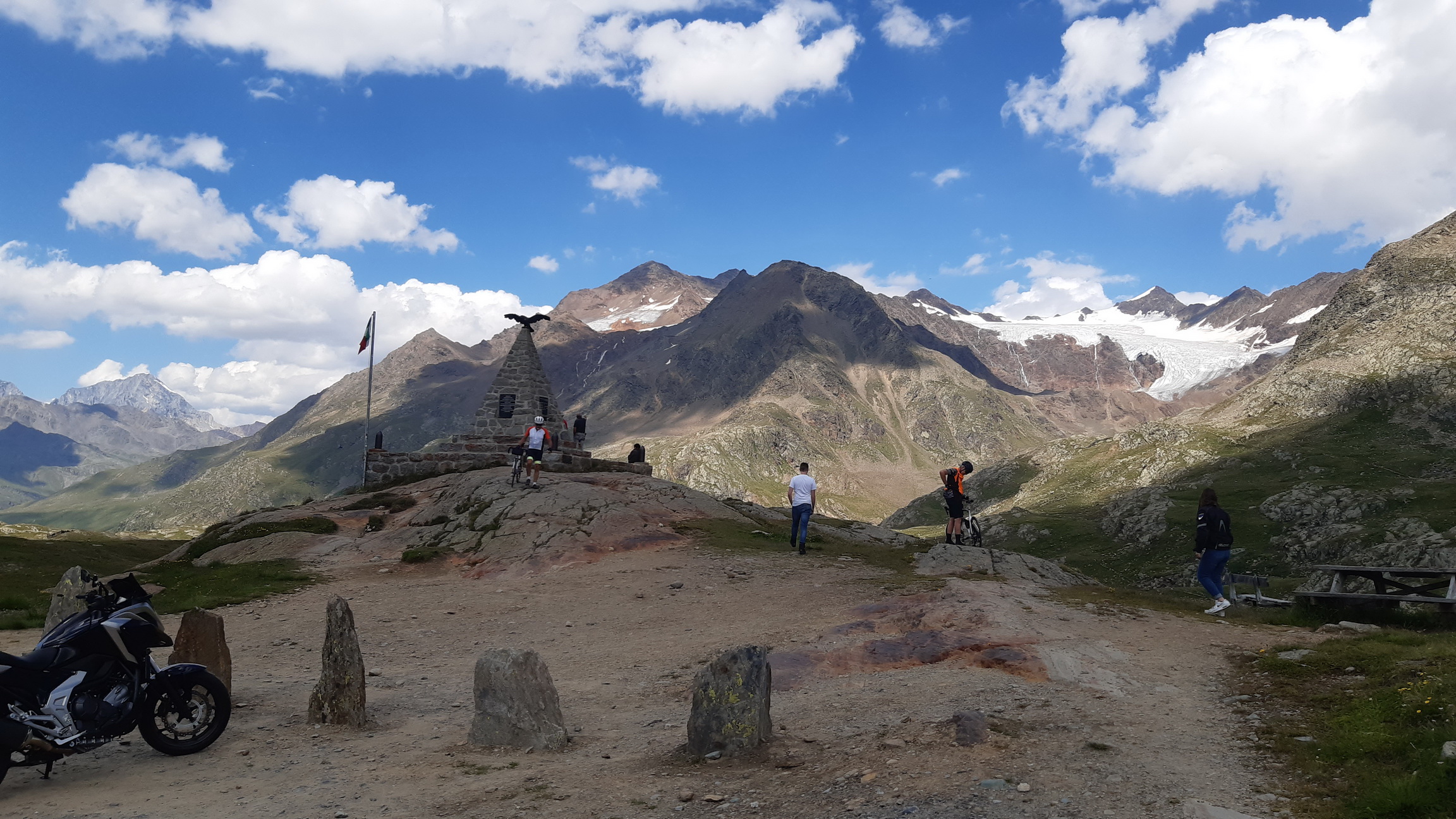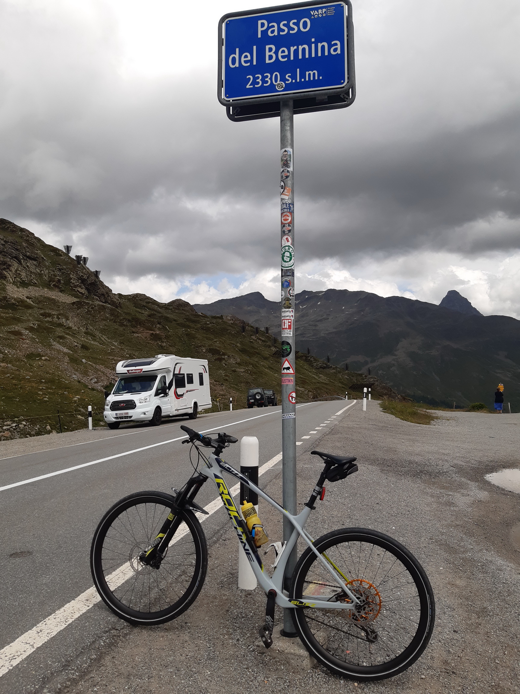Minútky pred ôsmou zjazdujem z Rosegu do Pontresiny. Mám na sebe všetko, čiže rukávy, termotričko, šuštiačku. Hneď v Pontresine si ju dávam dole, vyzerá, že bude teplo. Prvé stúpanie na passo Bernina je pohoda na zahriatie, vietor mám dobrý a tak za hodku a pár minút som hore. Nezastavujem nemám prečo a hneď sa púšťam do zjazdu. Stojím až na semaforoch. Trikrát sakra. Do Tirána prichádzam až cca dve hoďky po štarte. Ten zjazd mi aj so semaformi niečo trval, veď je to zas asi 1800 výškových dole a nejaké tie kilometre k tomu.