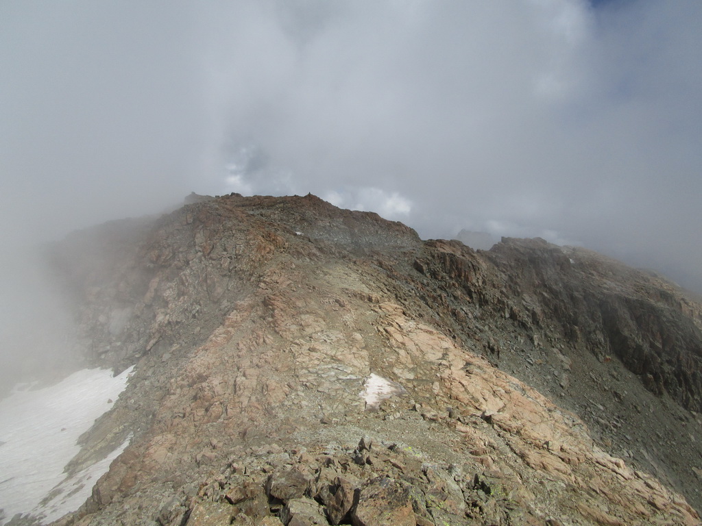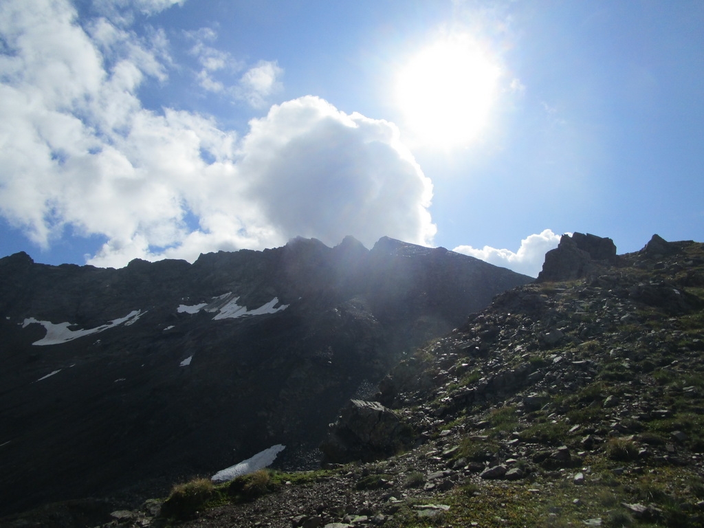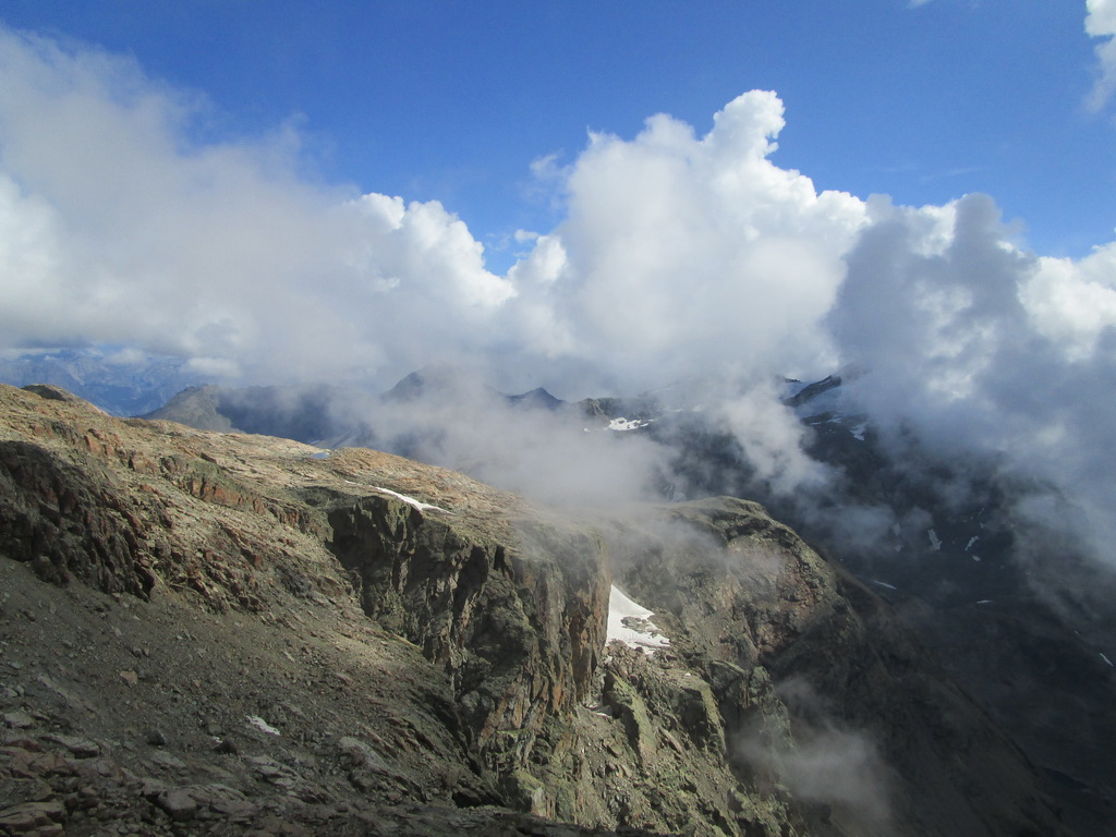 Najprv na mňa ľahký postup zo sedla hore smer Cima Saoseo pôsobí až nudne. "Tu nebude moc zábavy!" Pomyslím si. Nad vrcholom sa už ale robí povestná čiapka a tak najviac ma trápi či to bude dávať nejaký zmysel až hore nič neuvidím.