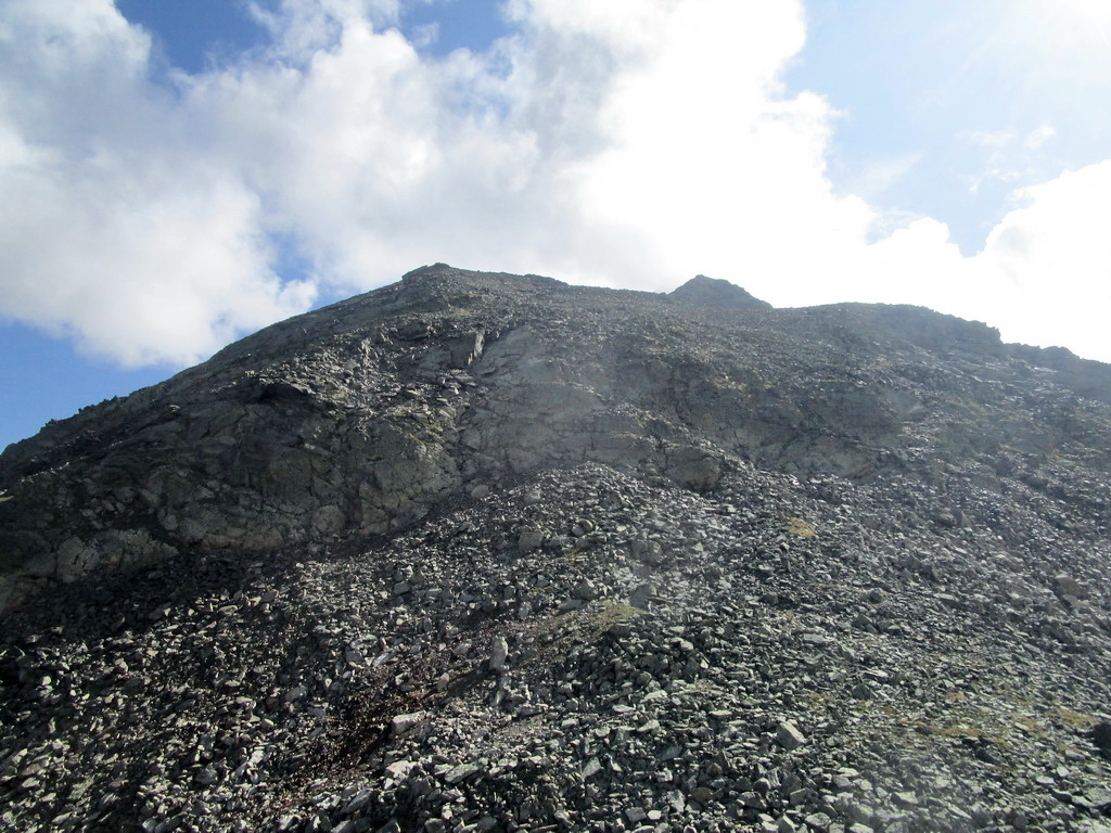 Ďalší postup zo sedla vyzerá v pohode po suti. Nachádzam trasu značenú skalnými mužíkmi a vydávam sa hore po nej. Tento kopec bude určite navštevovaný ľuďmi vyrážajúcimi z chaty Saoseo. Mužíci by ma mali zaviesť až hore.