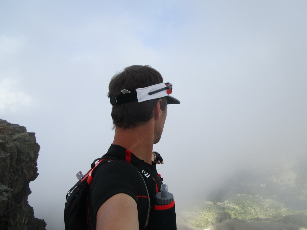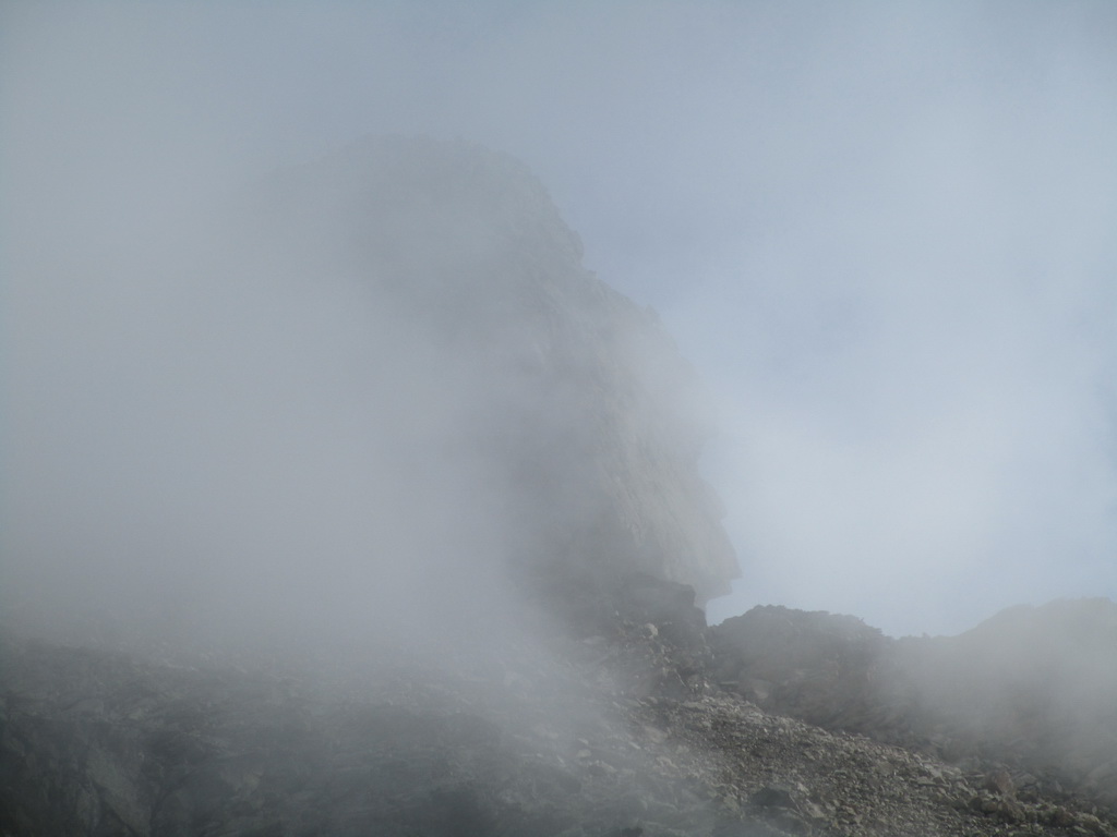 Za hranou už skalní mužíce prestanú traverzovať. Ide sa hore. Ľahké lezenie striedajú krátke traverzy. Nado mnou sa vznáša hmla. Nuž budem to musieť presne trafiť naspäť aj keby náhodou začalo pršať alebo sa zhoršila viditeľnosť. Hodinky mám ale zapnuté a tak som kľudný...