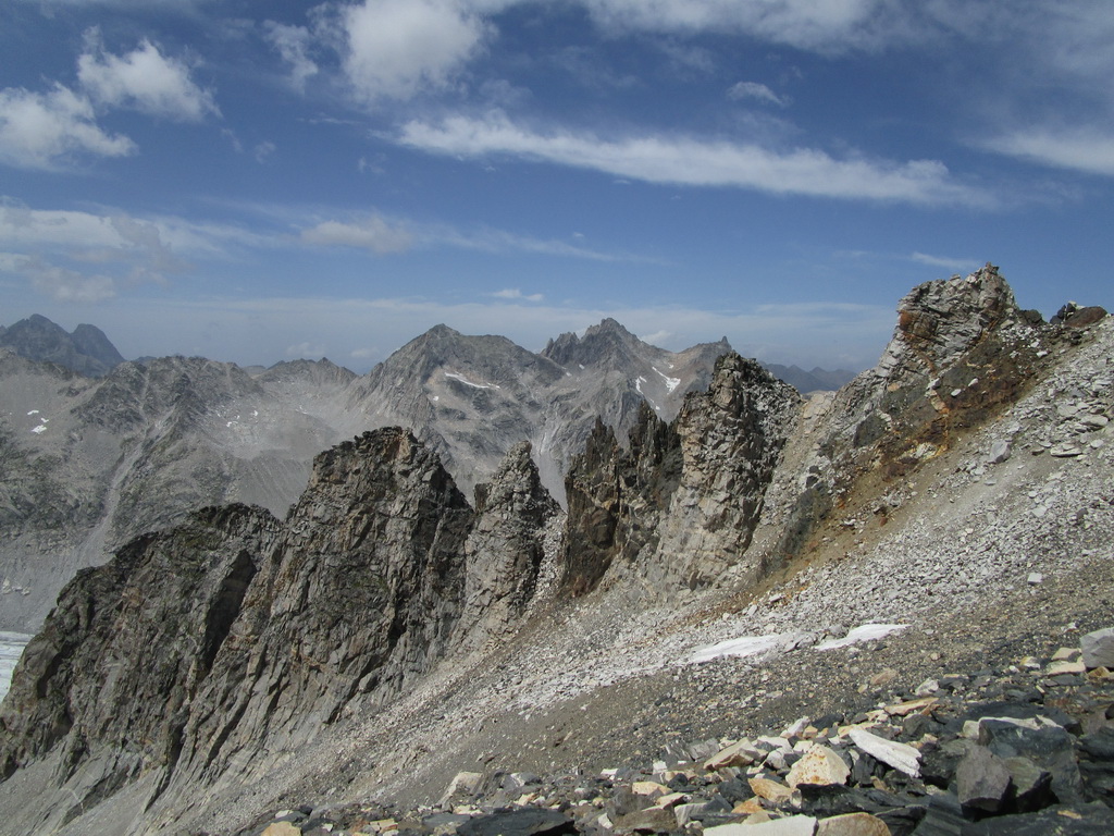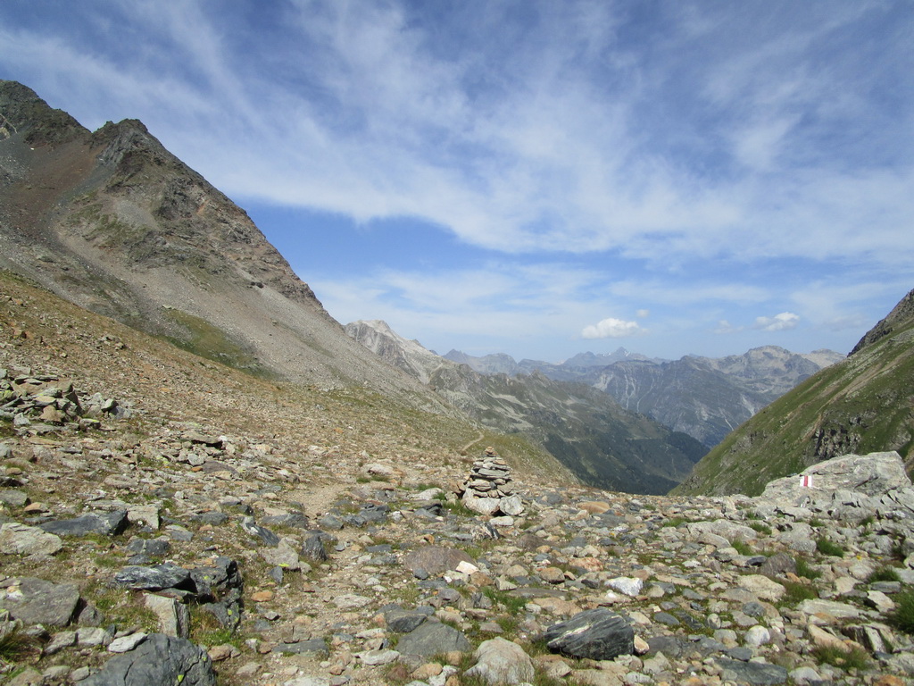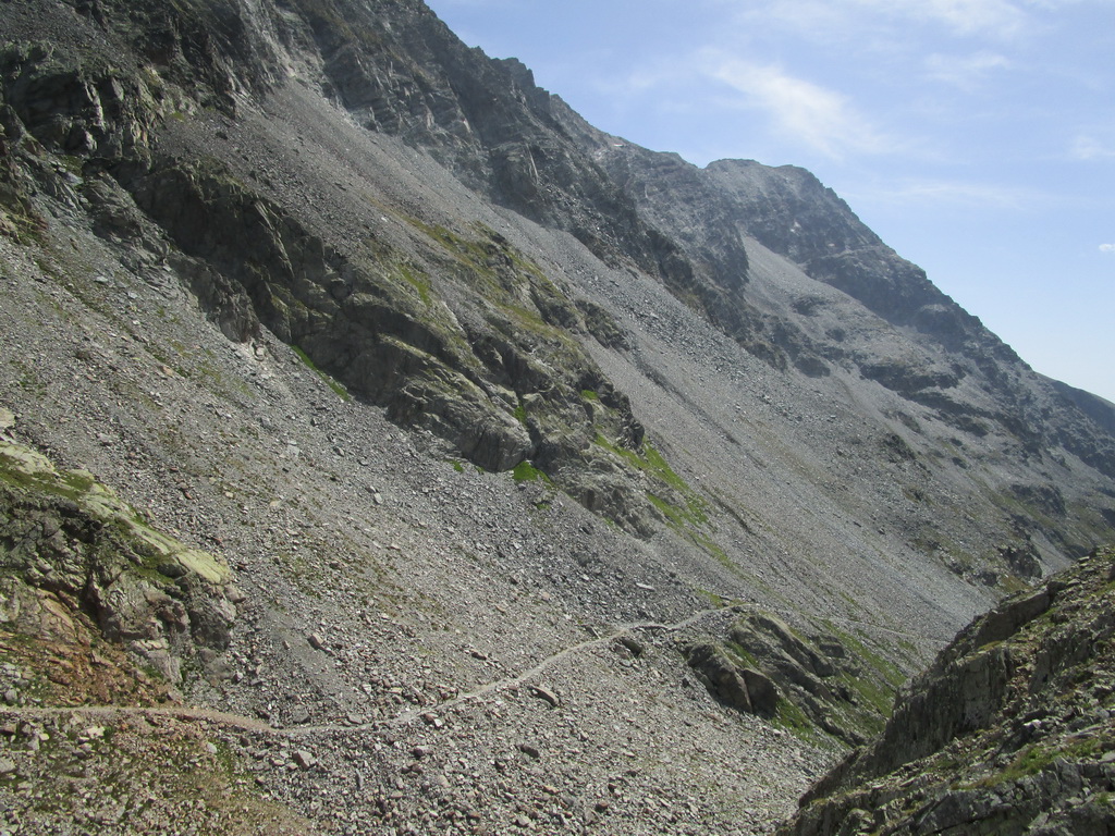 Na Talianskej strane chýba smerovník, dozvedám sa neskôr na chate, preto začnem zostupovať chodníkom do talianskej Val Malenco. Po chvíli si uvedomím, že asi nie som dobre a tak si to seknem svahom kde by mal byť správny chodník rovno hore. Nie hneď ale nájdem ho. Ďalej už je kvalitne značený.