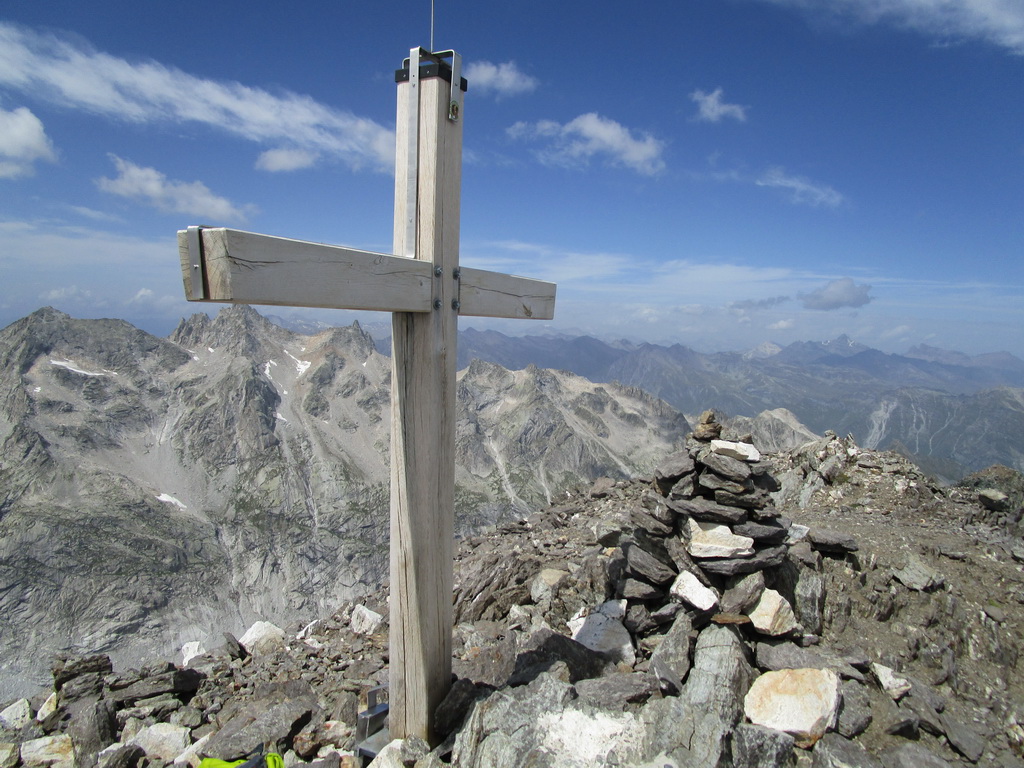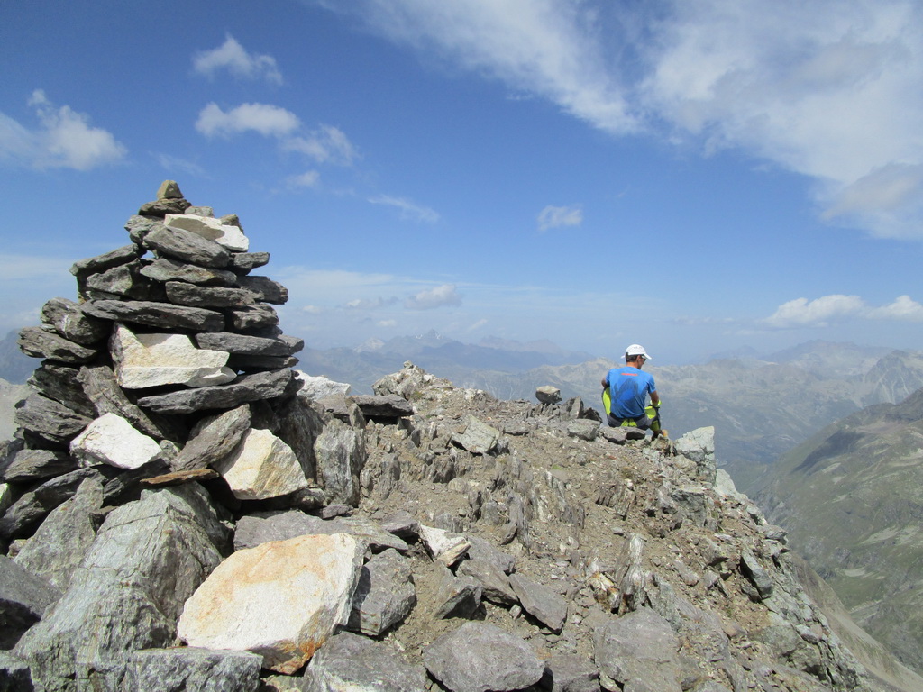 Ale odbočil som. Na vrchole Monte Forno si vychutnávam samotu a výhľady. Okrem iného vidím Val Malenco, rozľahlú taliansku dolinu na ktorú sa už chystám... Z oparu sa vynoruje Pizzo Scalino, 3323 metrov vysoká pyramída ktorá je miestom s najvyšším počtom pozorovaní UFO v Taliansku. Paráda! Možno stretnem aj nejakých ďalších zelených mužíkov.