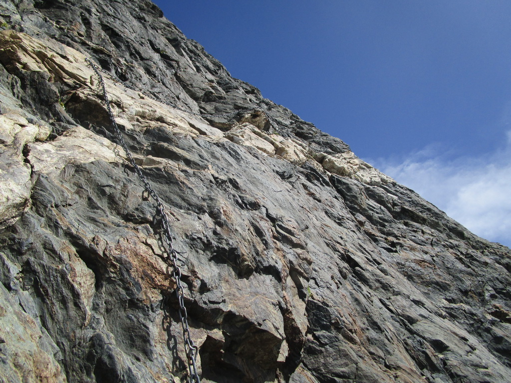 Prichádzam do passo Forno. Tu sa z červenej značky oddeľuje modrá, vysokohorská trasa na vrchol Monte Forno. Najťažší úsek je zabezpečený hrubými reťazami. Žiadna ferrata, je potrebné sa spoliehať na trenie obuvy a silno sa držať :)