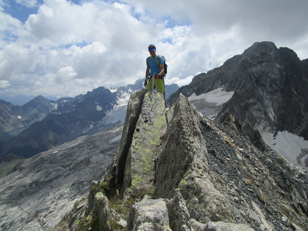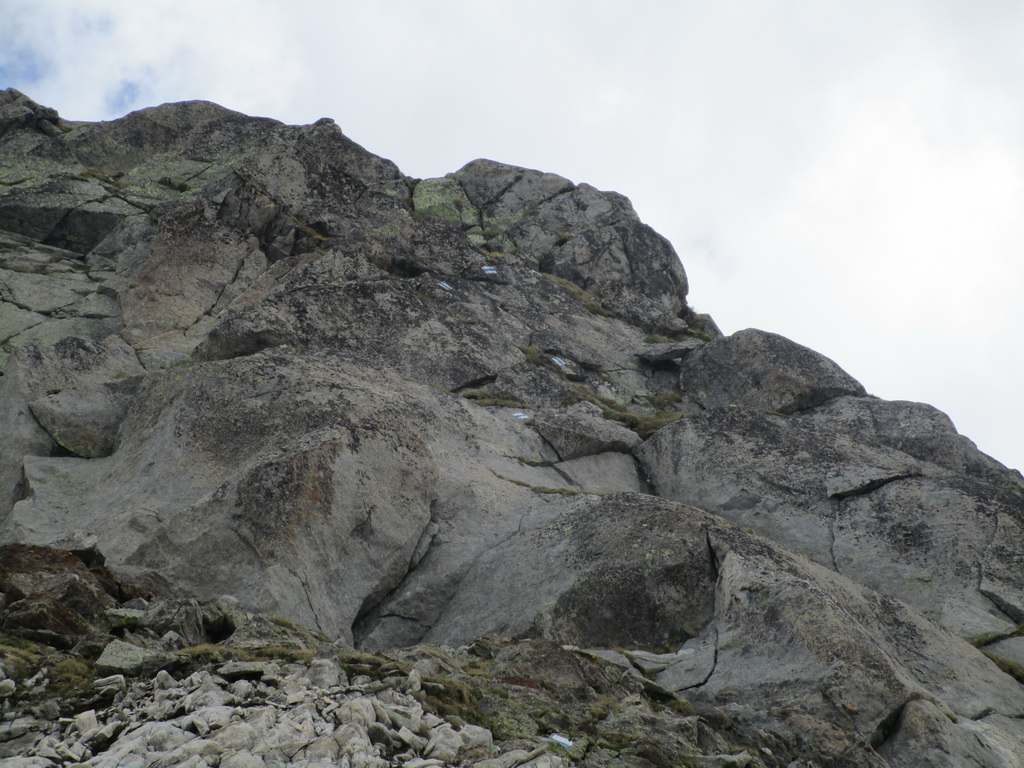 Vyrážam s pozdravom, že vidíme sa za pár hodín... Začiatok vedie po už známej trase na Monte Rosso, ktorú Beat dokončil minulý rok a report z nej si nájdete dole pod článkom. V miestach kde značka odbáča smerom hore na vrchol odbočuje doprava nová modrá značka. Tá ma zavedie až na Passo Vazzeda ale tesne pod ním tu je vyznačená odbočka doľava na vrchol Cima di Val Bona. Pod vrcholom pekný hrebienok, najkrajšie úseky zaistené reťazami.