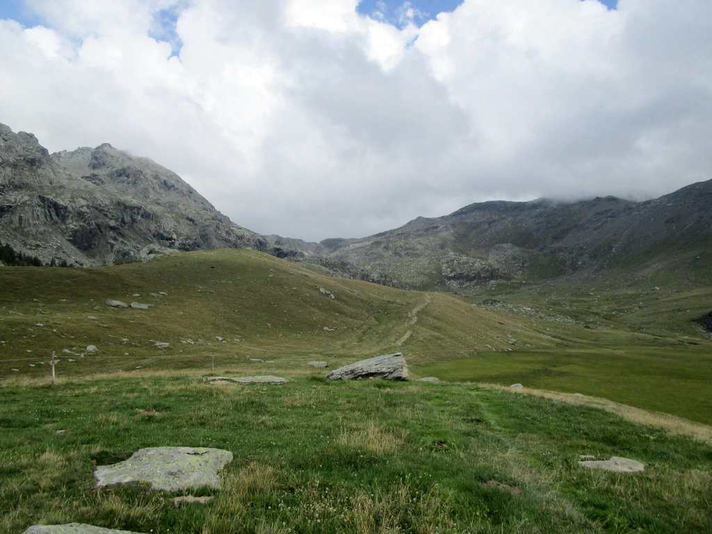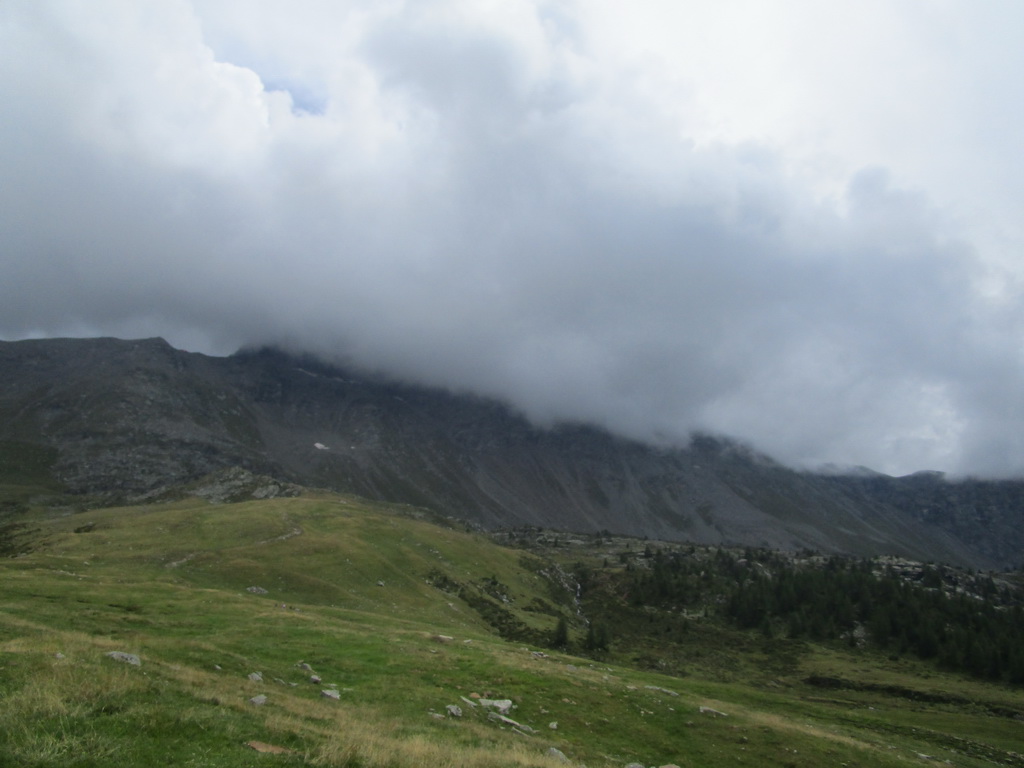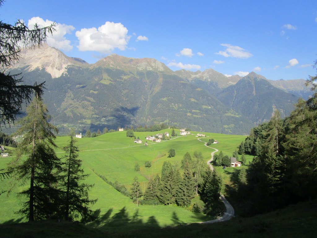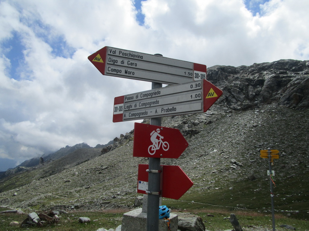 Netuším, čo ma čaká na druhú stranu, začínam zjazdovať ale po chvíli musím zosadať a zniesť bajk chodníkom kde sú úseky s reťazami. Dole kopcom sa však bajk prepraví ľahko a tak zakrátko už zjazdujem po lúkach a pasienkoch Campagneda. Prechádzam okolo chaty Rumsatsch a po spevnenej ceste sa blížim ku miestu s názvom Campo Moro. Až tu sa rozhodujem kde sa vlastne zvrtnem a začnem vraciať naspäť. Nakoniec rozhodnutie padne na návrat dolinou Val Poschiavina.