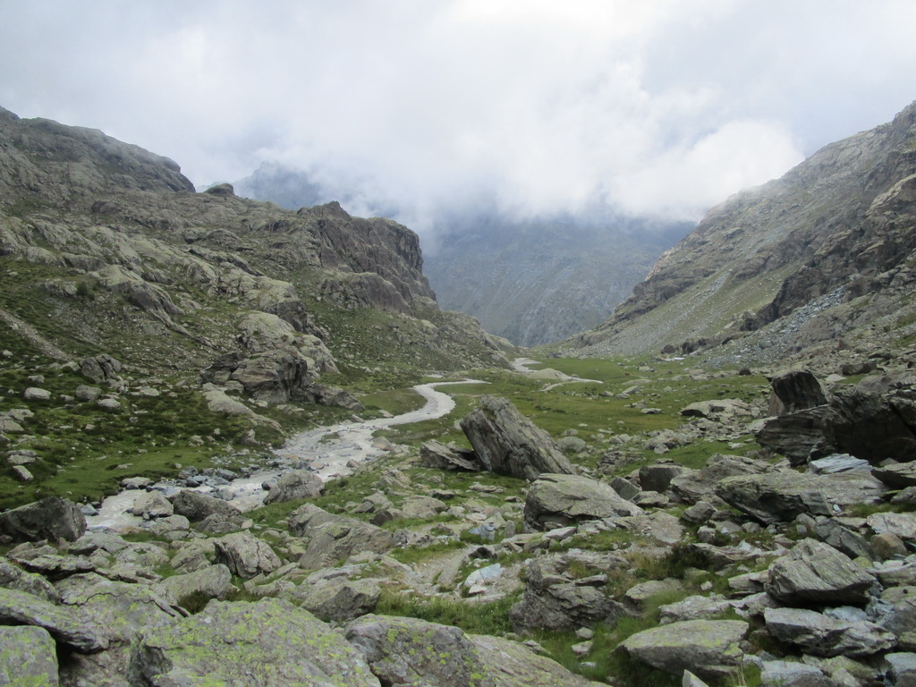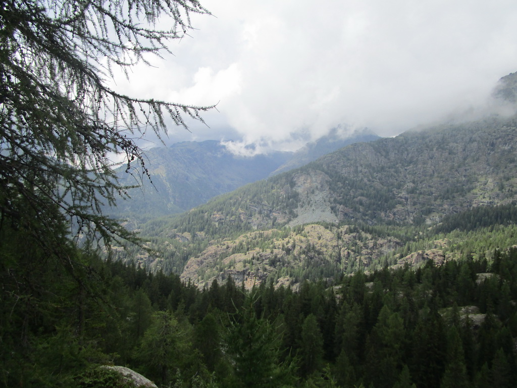Ku priehrade pohodlne vyšliapem na bajku po asfaltke. Od priehrady do ústia doliny Poschiavina to ide tiež v sedle. Otvárajú sa mi nádherné výhľady do ústia tejto doliny. Naháňa ma síce dážď ale nemôžem prestať fotiť. Začiatok doliny je zjazdný ale čoskoro začínajú úseky s veľkými kameňmi a treba tlačiť. Záver doliny Poschivina v stúpaní do sedla Ciancian je strmý technický úsek. Oceňujem že som si zobral karbónový bajk a ľahko sa mi nesie na chrbte.