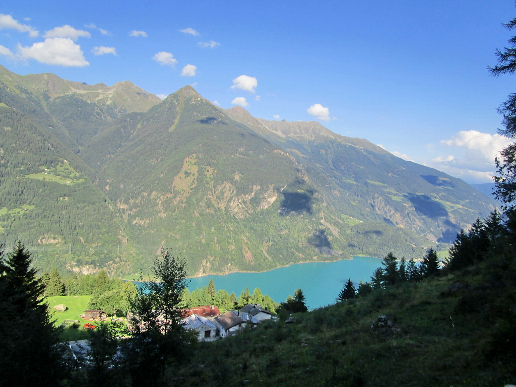 V sedle uzatváram okruh, zjazdujem už známym chodníčkom. Na začiatku ma čakajú aj chodecké úseky neskôr to už po spevnenej ceste je riadny fukot. Odvažujem sa ešte na zachádzku značenou cyklotrasou nad poschiavom s názvom Thron. Zjazdujem potom okolo rovnomennej usadlosti až dole ku jazeru. Odtiaľ ma ešte čaká stúpanie z Poschiava do Sfazú - 610v.m. po asfalte.