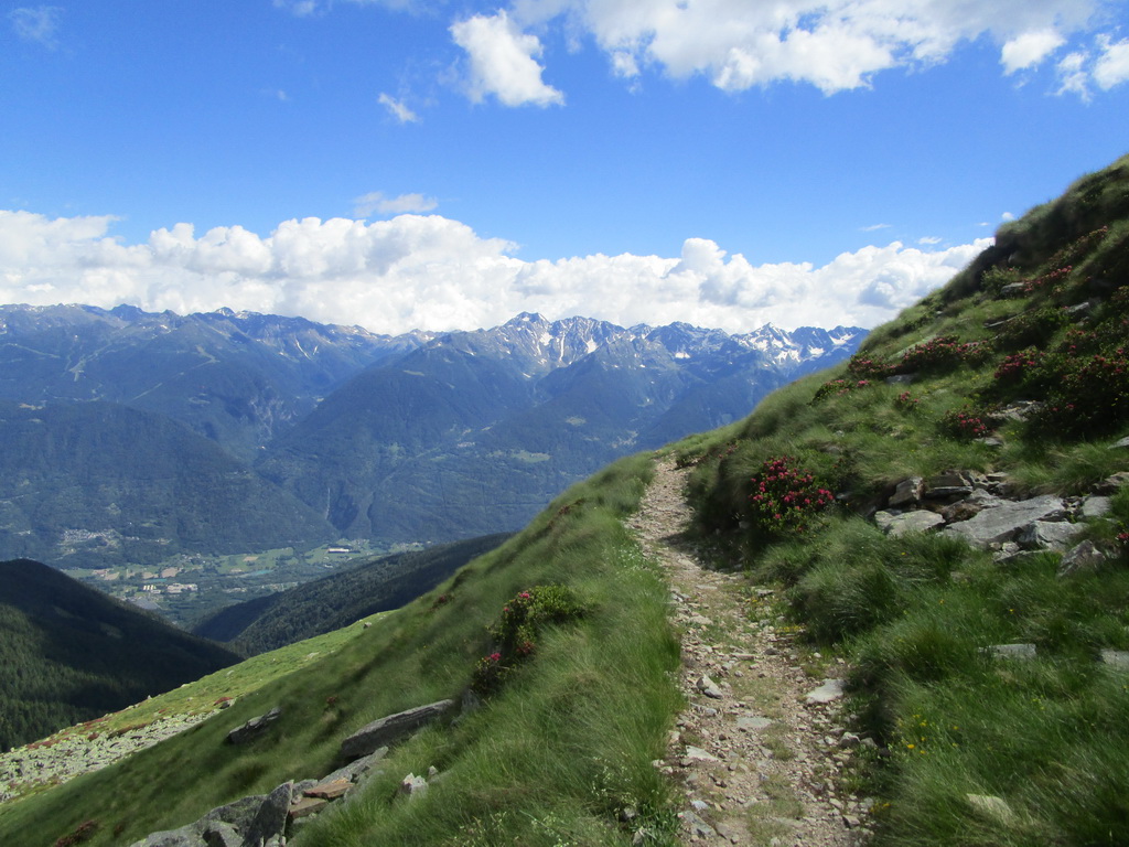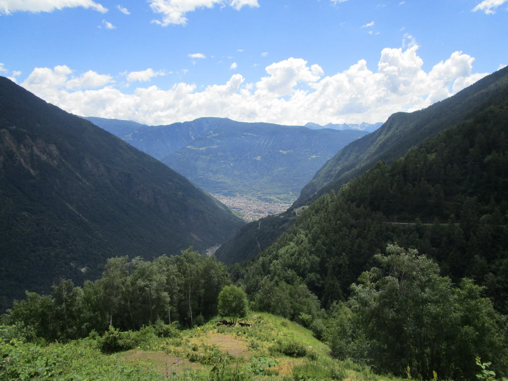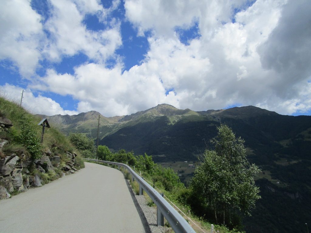 Pokračujem dlhým a krásnym chodníčkom. Krátke stúpania striedajú dlhšie zjazdové úseky až do Val Fontana. Odtiaľ už pokračujem v zjazde po asfaltke. Škoda, že musím zjazdovať veľa výškových metrov asfaltom ale nepokúšam sa hľadať nejaký chodníček v lese, dolina je úzka a oficiálne bajkové značenie ma udržiava na asfalte. Schádzam do údolia Valtelliny. Cyklistický raj na zemi... A kua koľko zelene... Lesy aj dole v údolí sa striedajú s kukuričnými poliami a jablkovými sadmi.