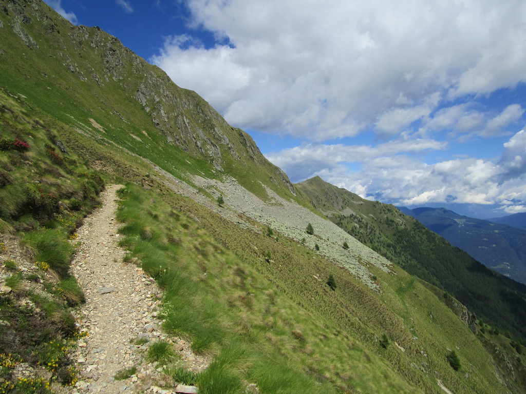 Neflákal som sa ale aj tak mi nepretržité stúpanie s 1550 v.m. zabralo 2:50 hod. V sedle som dal pauzu na občerstvenie a po krátkom zjazde k tabuli a odbočke som už pokračoval v prevažne traverzujúcom chodníčku. Väčšina chodníka sa dala ísť na bajku, iba občas som trošku potlačil. Stúpanie končí kúsok pod Medenpassom (2437m.). Odtiaľto už ide krásny zjazd až ku lyžiarskemu stredisku Monte Brione. Tu zjazd pokračuje, občas po štrkovej ceste a neskôr už zase pekným trailom v lese.