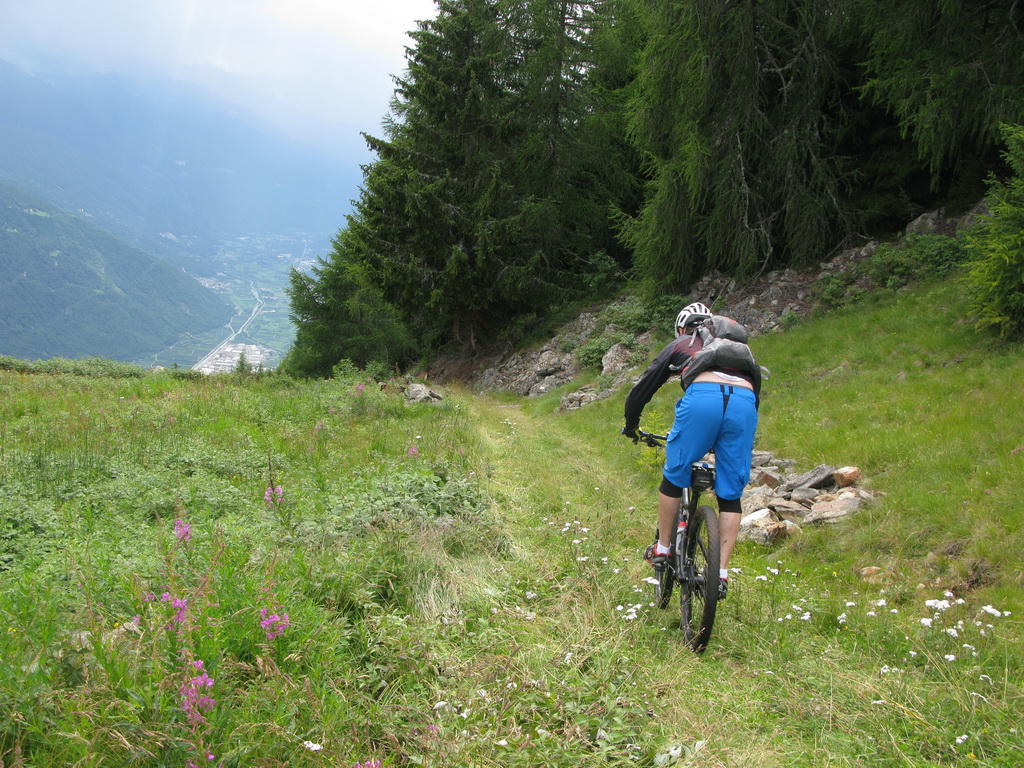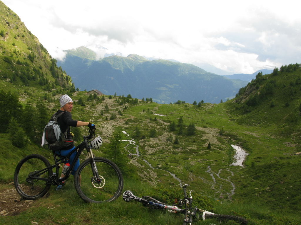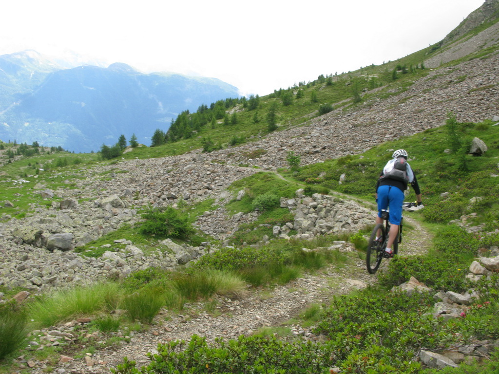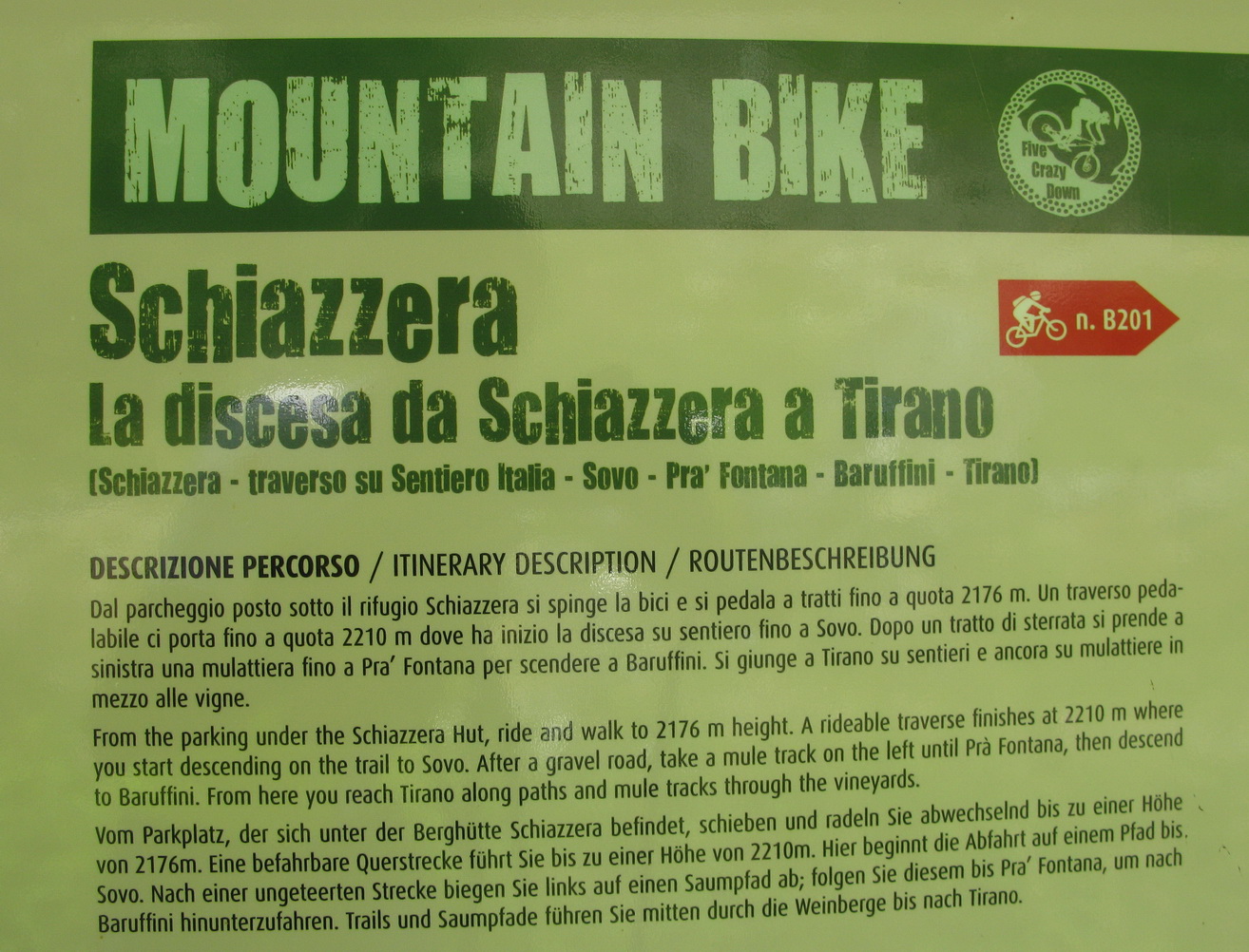 Nad chatou nás čaká ešte stúpanie cca 200v.m. ku začiatku zjazdu. Niečo tlačíme niečo dáme v sedle. Začiatok zjazdu je označený tabuľkou, mapkou. Vieme že sme dobre. Z hora tu prichádza chodník, ktorý je v mape tiež označený ako zjazdný pre bajkerov. Ten chodník traverzuje hory na dlhom úseku a začína až niekde v úplnom závere Val Grosiny. Je to jeden z tipov do budúcnosti, spojiť ten traverz z následným zjazdom do Tirana to by bola určite supertúra.