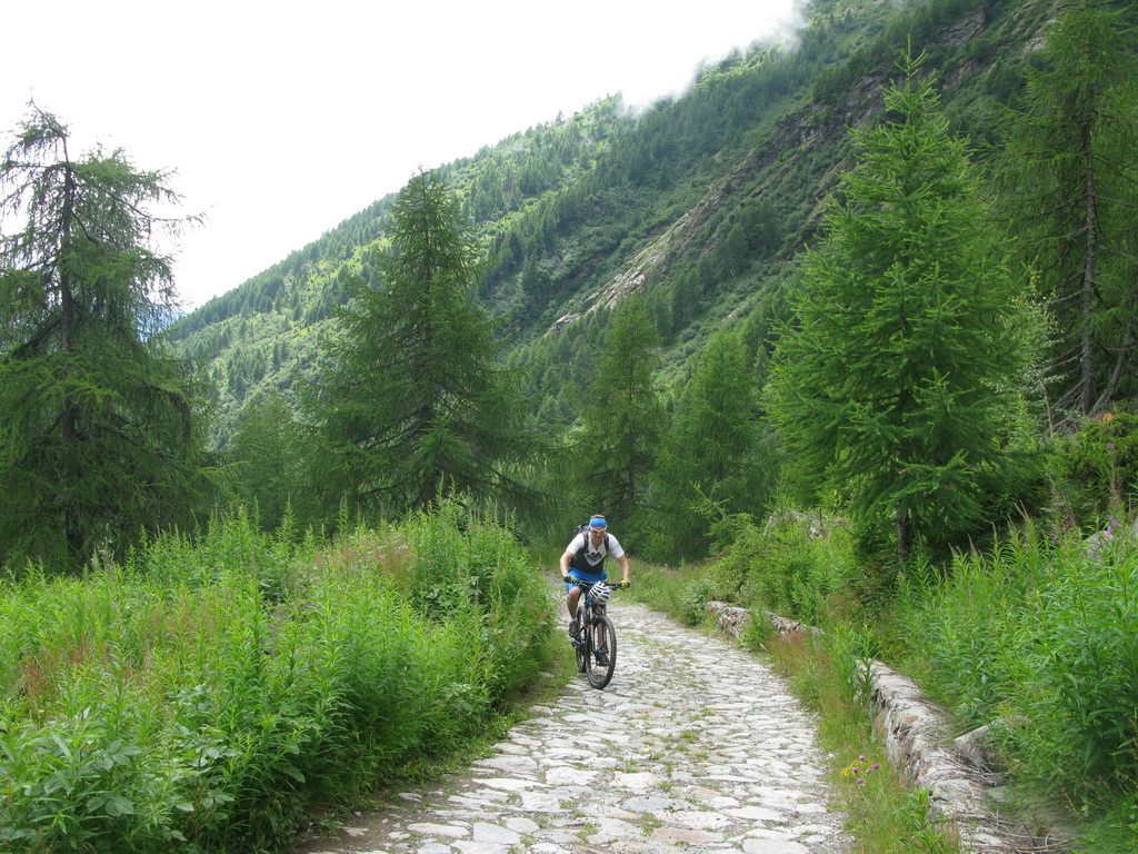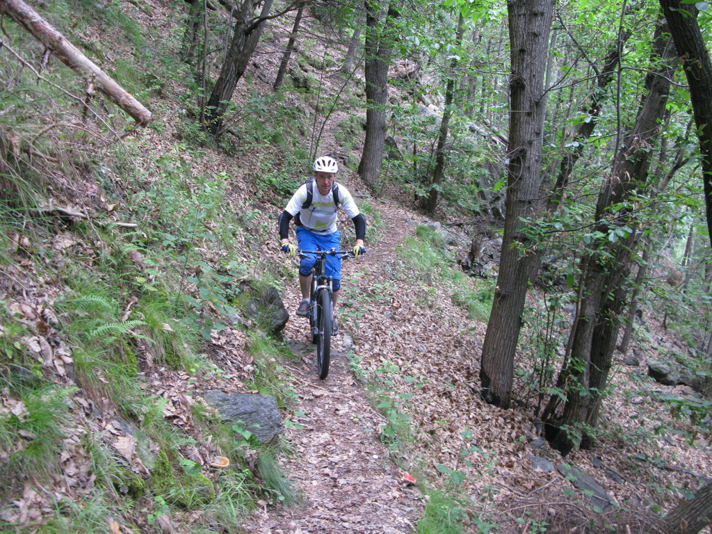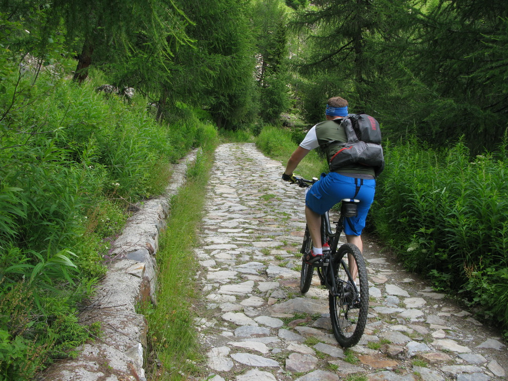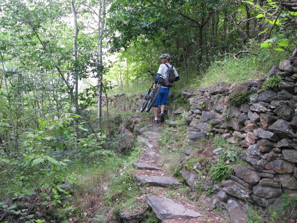Nad chatou nás čaká ešte stúpanie cca 200v.m. ku začiatku zjazdu. Niečo tlačíme niečo dáme v sedle. Začiatok zjazdu je označený tabuľkou, mapkou. Vieme že sme dobre. Z hora tu prichádza chodník, ktorý je v mape tiež označený ako zjazdný pre bajkerov. Ten chodník traverzuje hory na dlhom úseku a začína až niekde v úplnom závere Val Grosiny. Je to jeden z tipov do budúcnosti, spojiť ten traverz z následným zjazdom do Tirana to by bola určite supertúra.