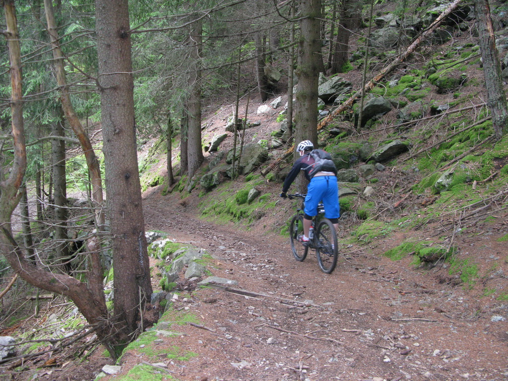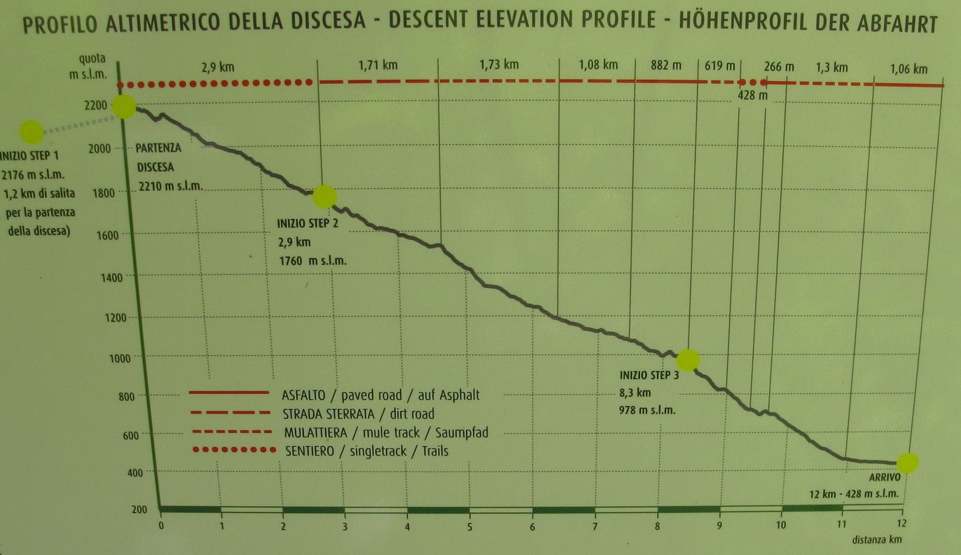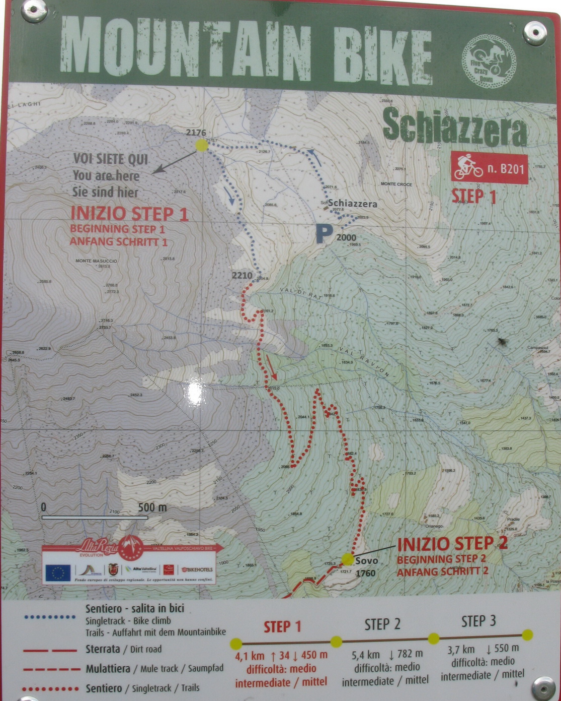 Opäť sa vnárame do lesa. Asfalt končí ale cesta je naďalej luxusná. Prichádzame naparkovisko pod chatou. Až potiaľto je možné prísť s autom, nie je tu žiadny zákaz. Na parkovisku už nachádzame našu starú známu tabuľu s mapkou trailu, popismi, profilom. Päť Valtellinských zjazdov je plánovaných pre jazdcov, ktorí jazdia s podporou auta a preto značenie začína vždy až od parkoviska...