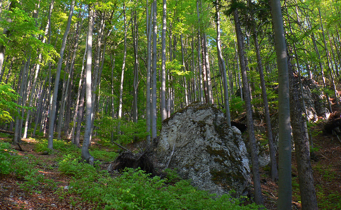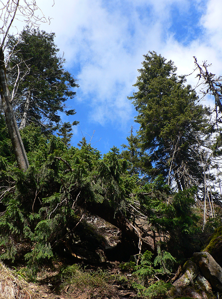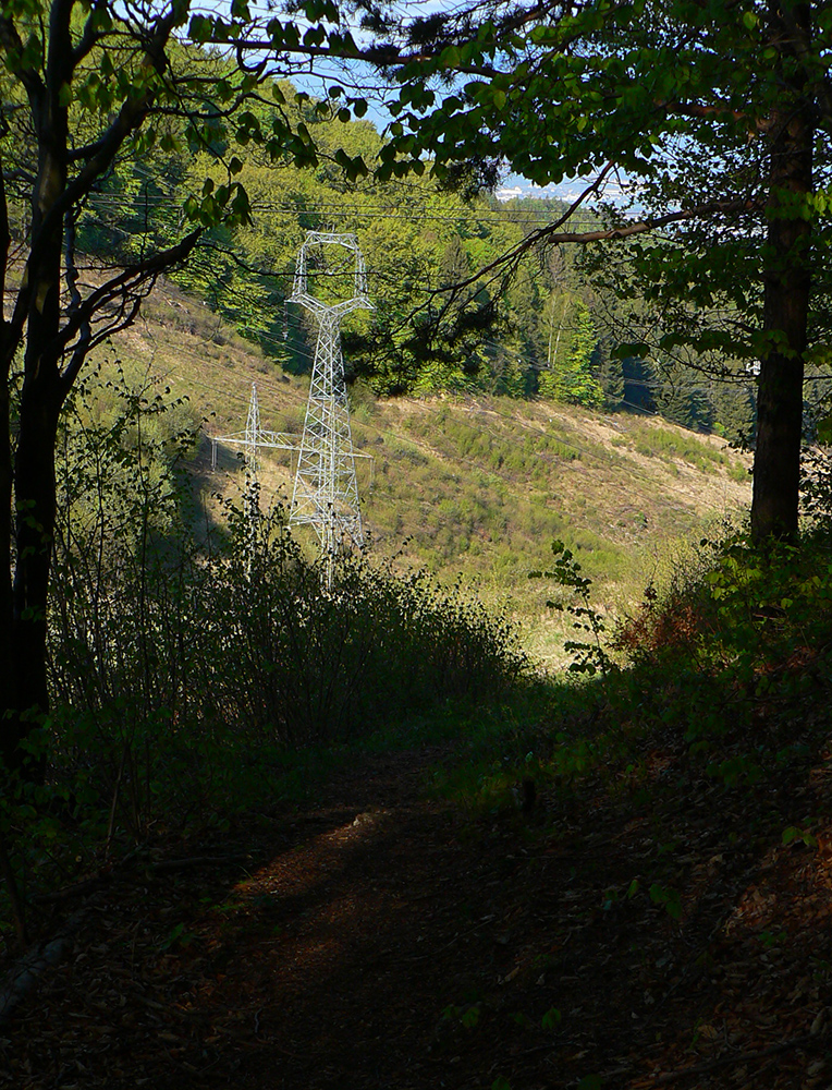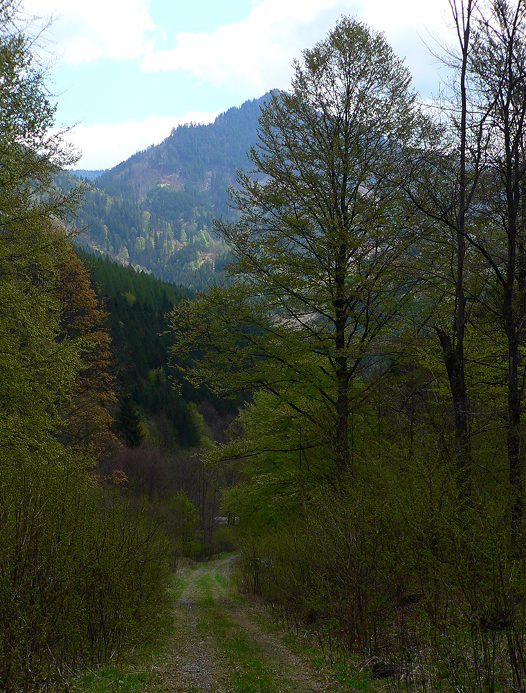 Znovu ponor nahor - do strmého lesa, tentokrát hustejšieho. Aj boj s gravitáciou hustejší, či to nohy redšie? Po zemi stále častejšie tancujú fliačiky svetla a temnú zeleň smrečín prebíja sivá zeleň lúk.