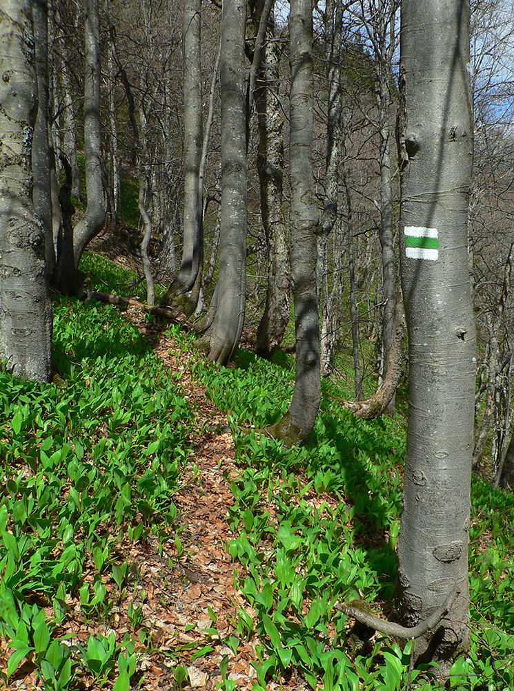 Zelená je pre zostup (či skôr ústup) symbolická: bukovo zeleno nad hlavou, cesnakovo zeleno pod nohami, že ani chodník nevidieť. A voňavo. A poriadne strmo, spádnicovo. Tadeto veľa ľudí nechodí.