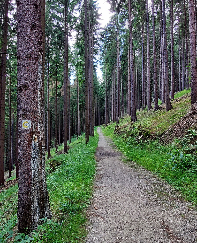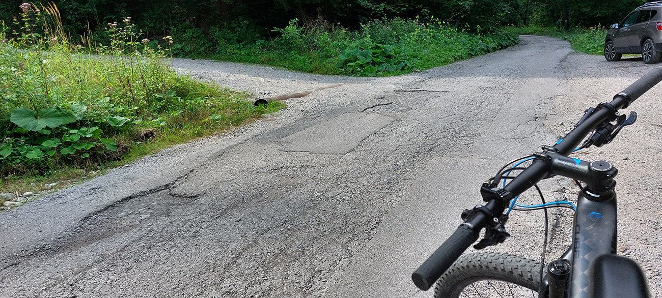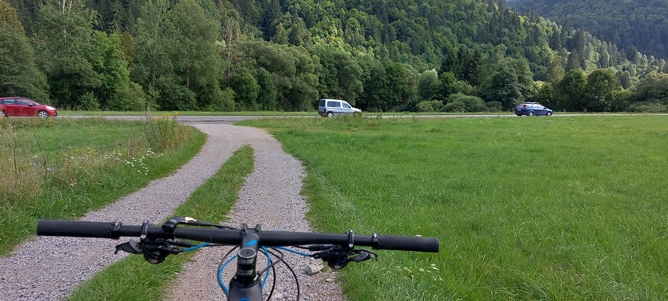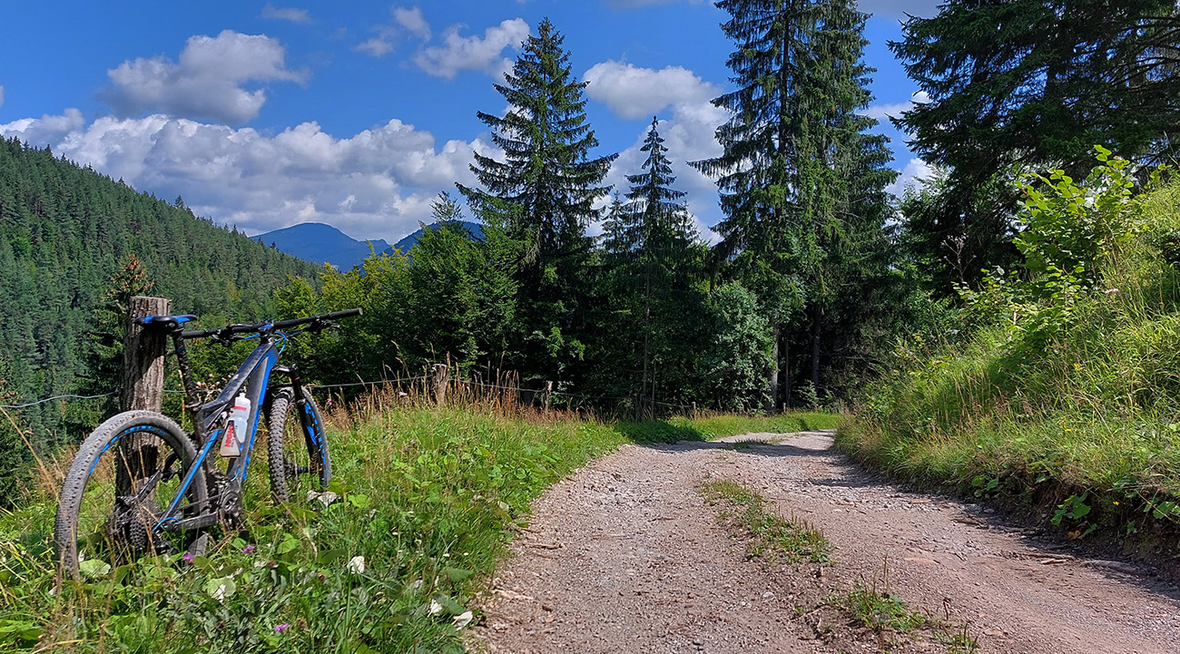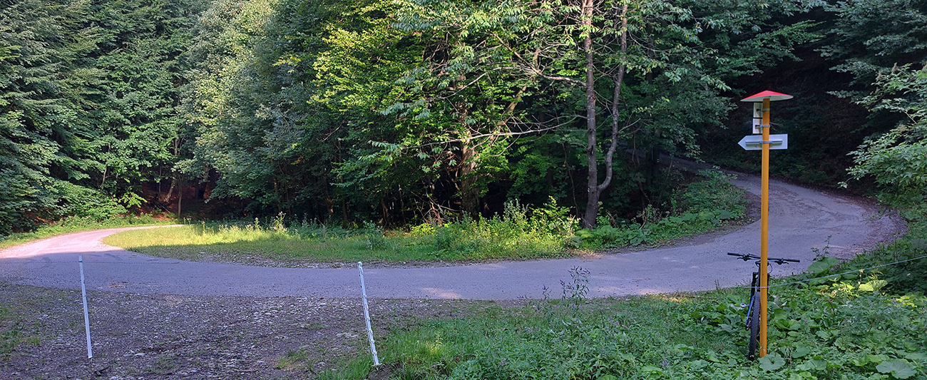 Zo sedla Príslop kratučký dolekopec na zvážnicu, ktorou sa dá dostať dole na dno Ľubochnianskej doliny. Najprv pár metrov pohodlne lesným priesekom, bajkeri poznajú, ešte aj šípka je na strome. Potom pár metrov strmo, ale jazditeľne. Pre istotu som ale zniesol, predsa len – veľké skaly, konáre, medzi nimi slizká hlina a ja biedny technik. Nikam som sa nehnal. Dole na ceste dve možnosti: doprava aj doľava. Obe ústia nižšie v bočnej dolinke, na starej asfaltke pri Tureckom potoku a k horárni Salatín je to potom už rýchly a rovný zjazd. Tu by sa pýtalo vyznačiť cyklotrasu, bolo by to parádne prepojenie Turca a Liptova.