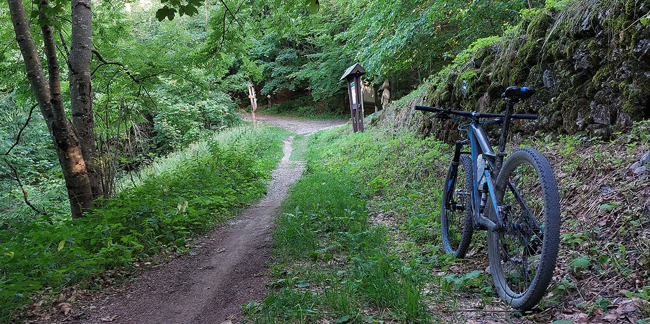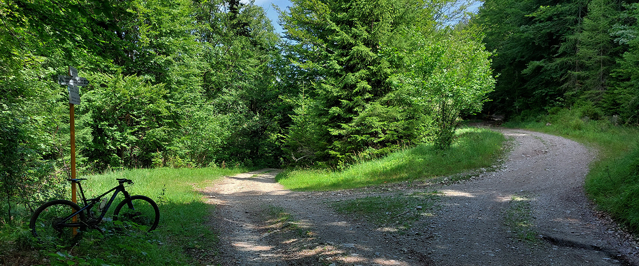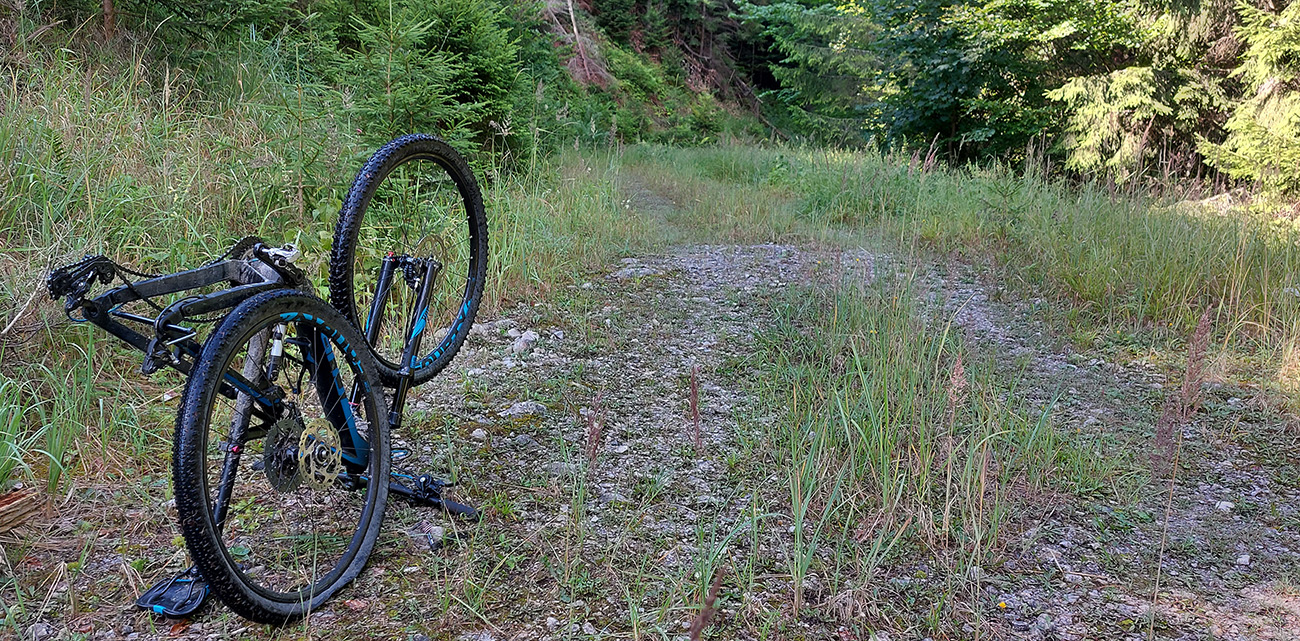 Na jar, keď som tu bol peši, išiel som doľava, tak teraz som skúsil doprava. Tam viac vlhka na severných svahoch, aj viac vody pod kolesami, takže trochu zarastenejšia, ale stále výborná cesta. Len asi po 500 m zrazu psssssssssssssssss! A už som obracal bajk hore bruchom a vymieňal dušu. Dáky tŕň či čo. Náhradnú som mal na ráme prilepenú a vrecká plné, takže po výmene išli dva banány do brucha a miesto nich tá deravá duša do dresu, lebo lepiacu pásku so sebou nenosím a ani batoh som nebral, veď civilizácia je tu všade blízko :-)