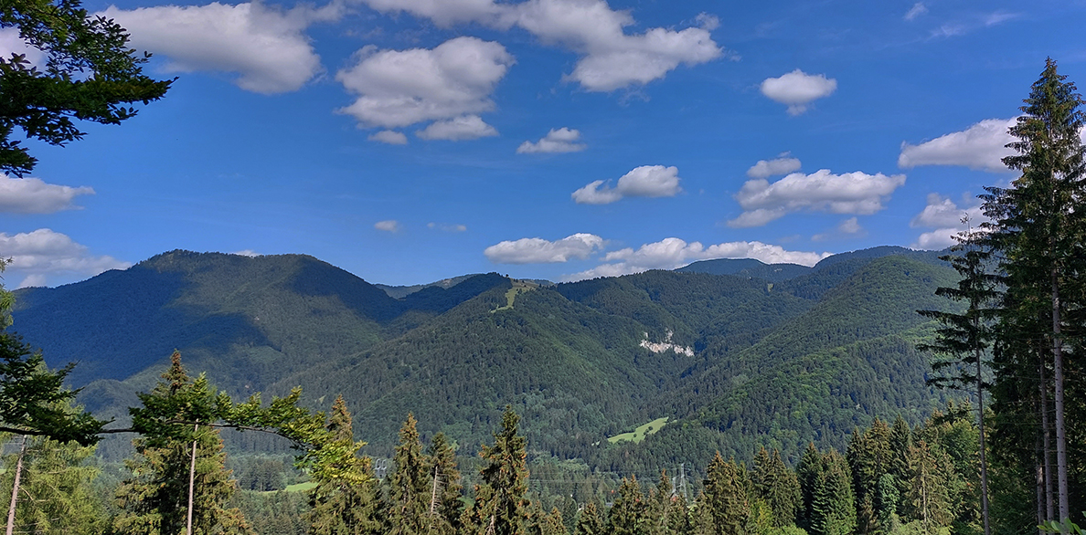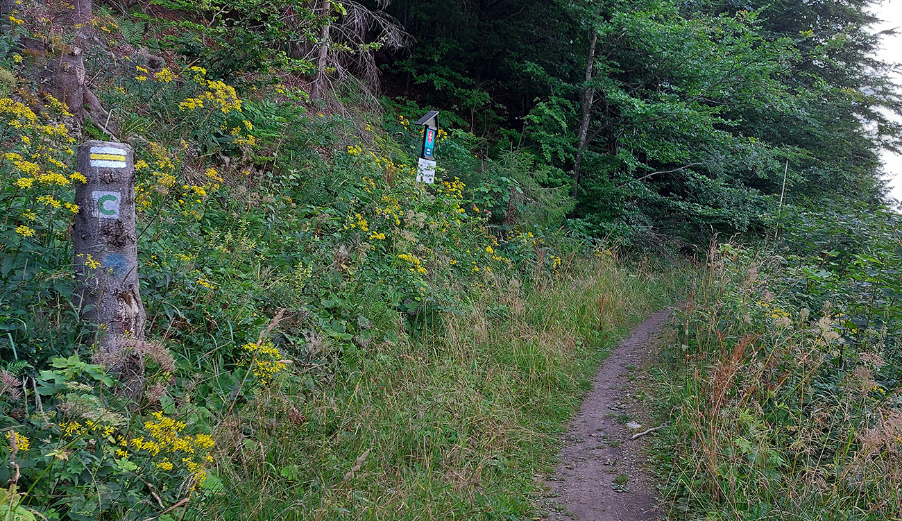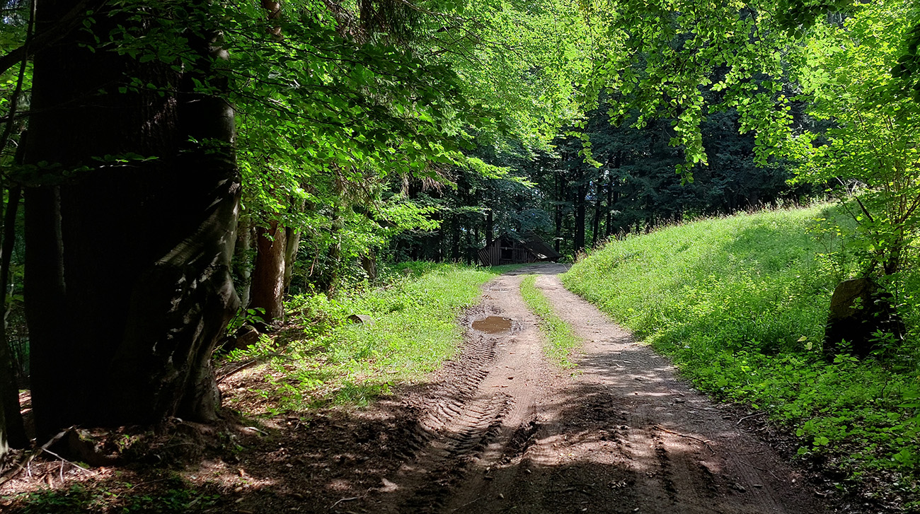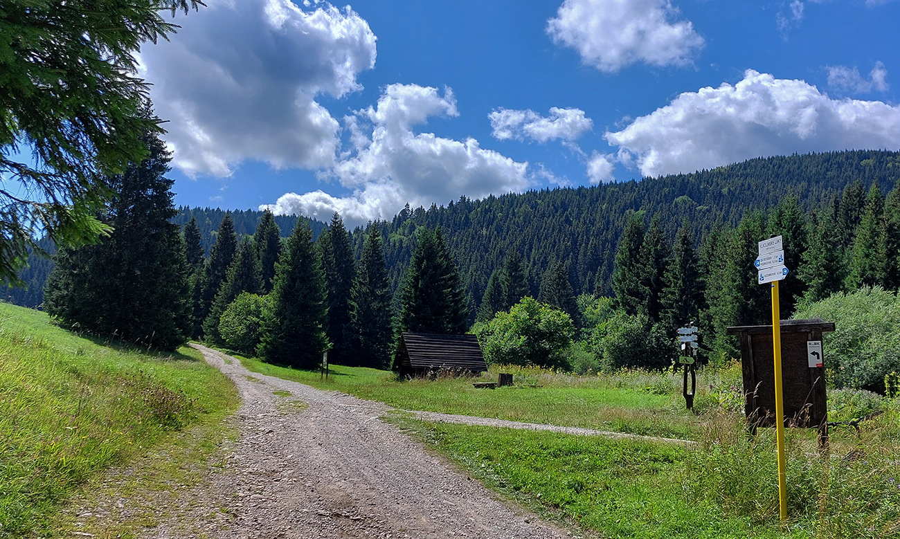 No a pod Vlkolíncom, od križovatky v Trlenskej doline, nasledovali pokusy o obchádzanie hlavnej cesty E77. Možnosti tu sú, tá v mojom smere najlepšia je zelená cyklotrasa 5422. Najprv peknou dolinou, potom príjemný tieň v lese, v druhej polovici aj rúbaniská a cez ne spätné pohľady k Sidorovu s Vlkolíncom. Nad Nižným Matejkovom sa cykloznačka síce točí nazad na sever, smerom na Jazierce, ale po východe z lesa mi stačilo len odbočiť po lúkach doprava a lúčna cesta ma zviedla, kam som potreboval. Síce som musel pár metrov prežiť aj na krajnici hlavnej cesty (krátky kultúrny šok hehehe), ale z Nižného do Vyšného Matejkova už príjemnejšie po lúkach, po červenej značke až ku známej kolibe Bodega.