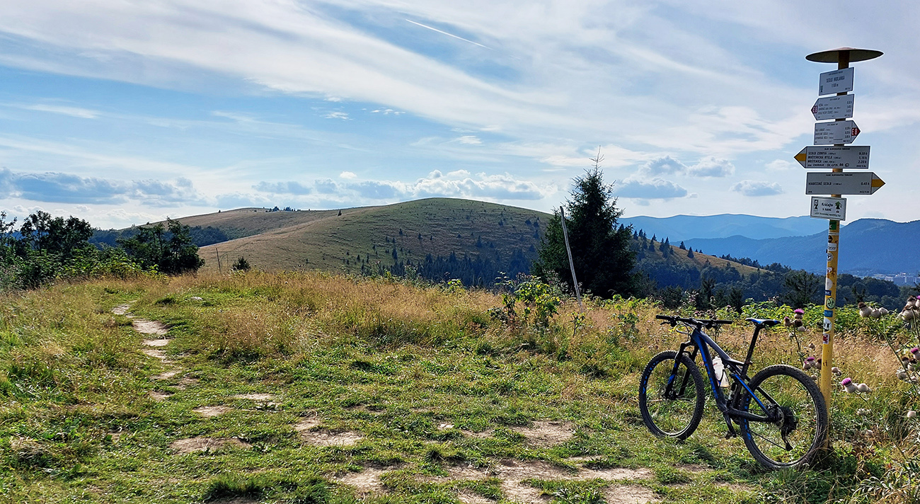 Smerom na Donovaly je ešte zopár krátkych úsekov hore aj dole kopcom, ktoré ani po vlastných nie sú pohodlné, najmä kvôli množstvu voľných kameňov. Ale jazdiť s trochou citu sa to dá, nič zložité. Potom už pod kolami hlavne hlina. Pred Poliankou som samozrejme odbočil doľava, načo zachádzať? Po chvíli som si mohol pod Hrubým vrchom už naplno užívať rozhľady z lúk, najmä na blížiaci sa Panský diel. Kto pozná chodníky medzi Donovalmi a Šachtičkami, vie o čom hovorím. Kto tam ešte nebol, vrelo odporúčam: pekná krajina, dobré cesty a veľa možností.