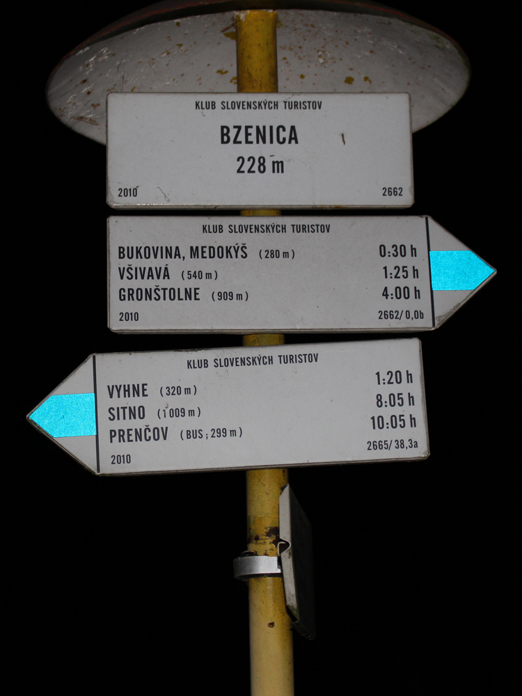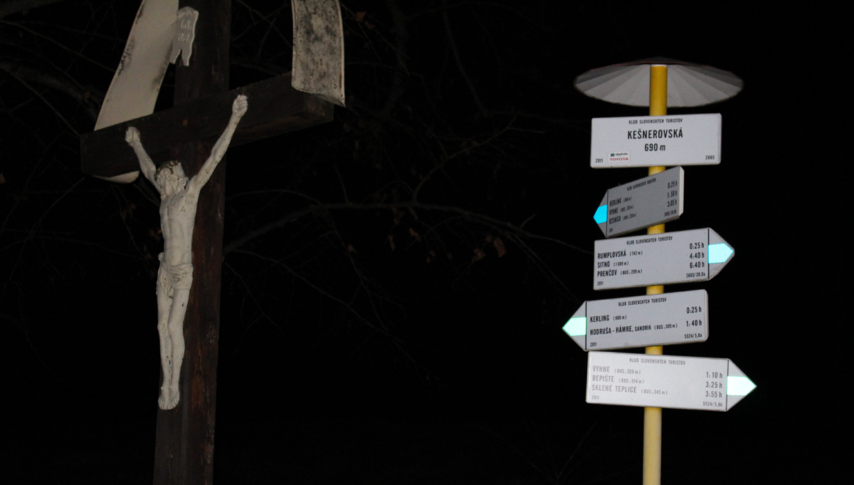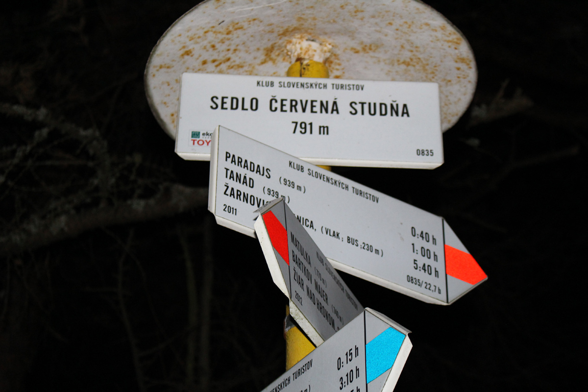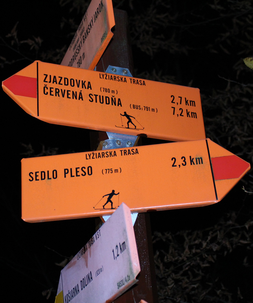 Po modrej spátky dole a červenou cez Tanád a Paradajs na Červenú studňu, budú aj výhľady na Štiavnicu. Myšlienka pekná ,ale som z nej rýchlo vytriezvel, keď som stratil niť niekde na rozrytých lúkach pod Kanderkou a po asi polhodinovom kufri sa ocitám na cyklotrase a tam na smerovníku: Červená studňa 7km. Dnes v noci Štiavnicu neuvidím, optimalizujem po cyklotrase a po modrej do Vyhní. Tam ma víta skládka odpadu, no FUJ. Ďalej do Bukoviny po značke, na lúkach pri potoku po členky v bahne - čistý kravkaňón. Do Bzenice dorazím moc skoro, je všetko zavreté. Idem do Bukoviny, kým ta prídem otvoria. Cestou vypínam čelovku, stretám posýpačov. Jeden, druhý, tretí - tiekli dole ako jarná voda. Nedá mi to, opýtam sa ,,obchod máte otvorený?" Že o hodinu skôr otvoria dole. No ništ, idem späť a tam pred Jednotou pol hodinu pred otvorením v rade nastúpení posýpači.