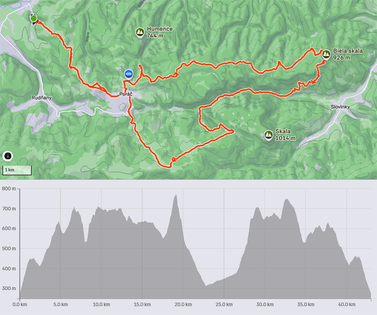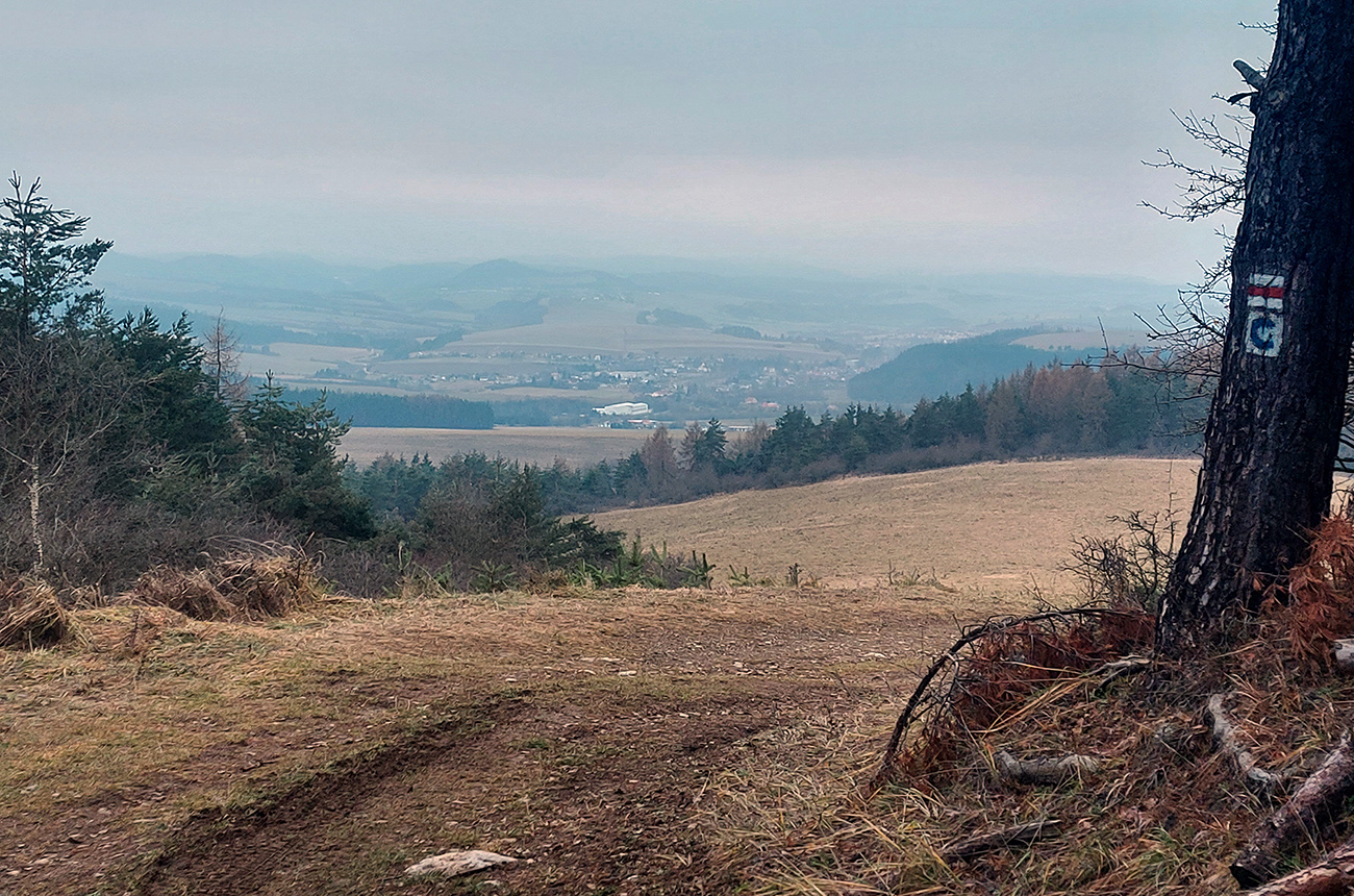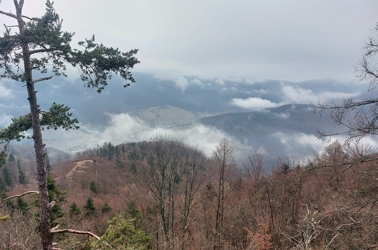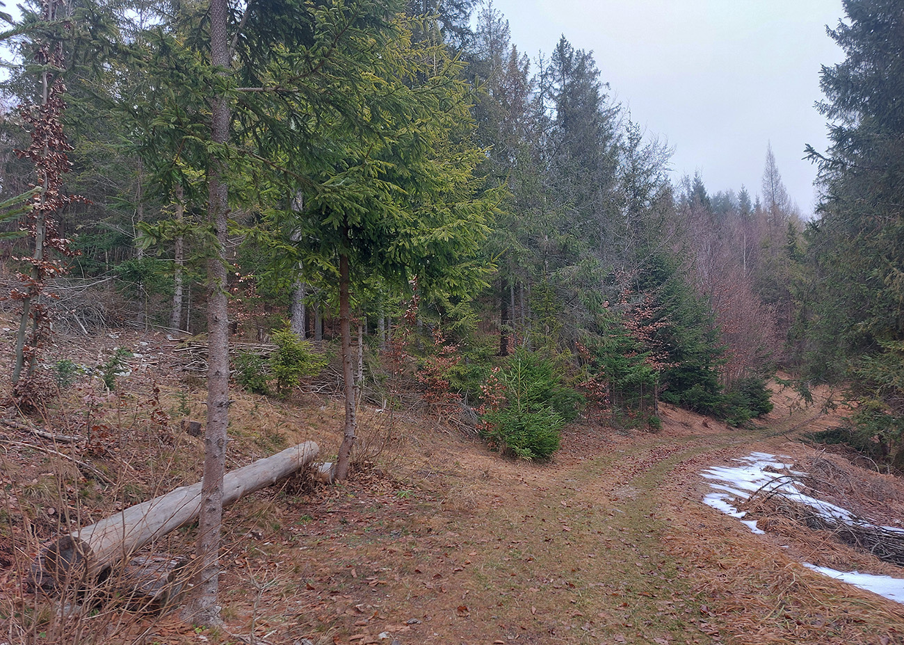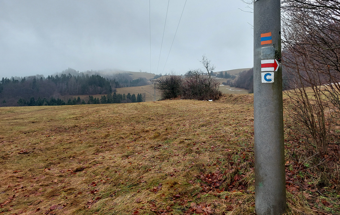 Strmá zachádzka po žltej na vyhliadkovú Bielu skalu (926 m) sa oplatila aj v tomto prípade, aspoň Slovinky a blízke okolie bolo trochu vidieť. Ale náprotivná Skala bola v mraku, tak som sa radšej skotúľal po cyklotrase na dno Poráčskej doliny, že hádam od potoka budú cez holé lesy nejaké tie výhľady na bralá na jej svahoch.