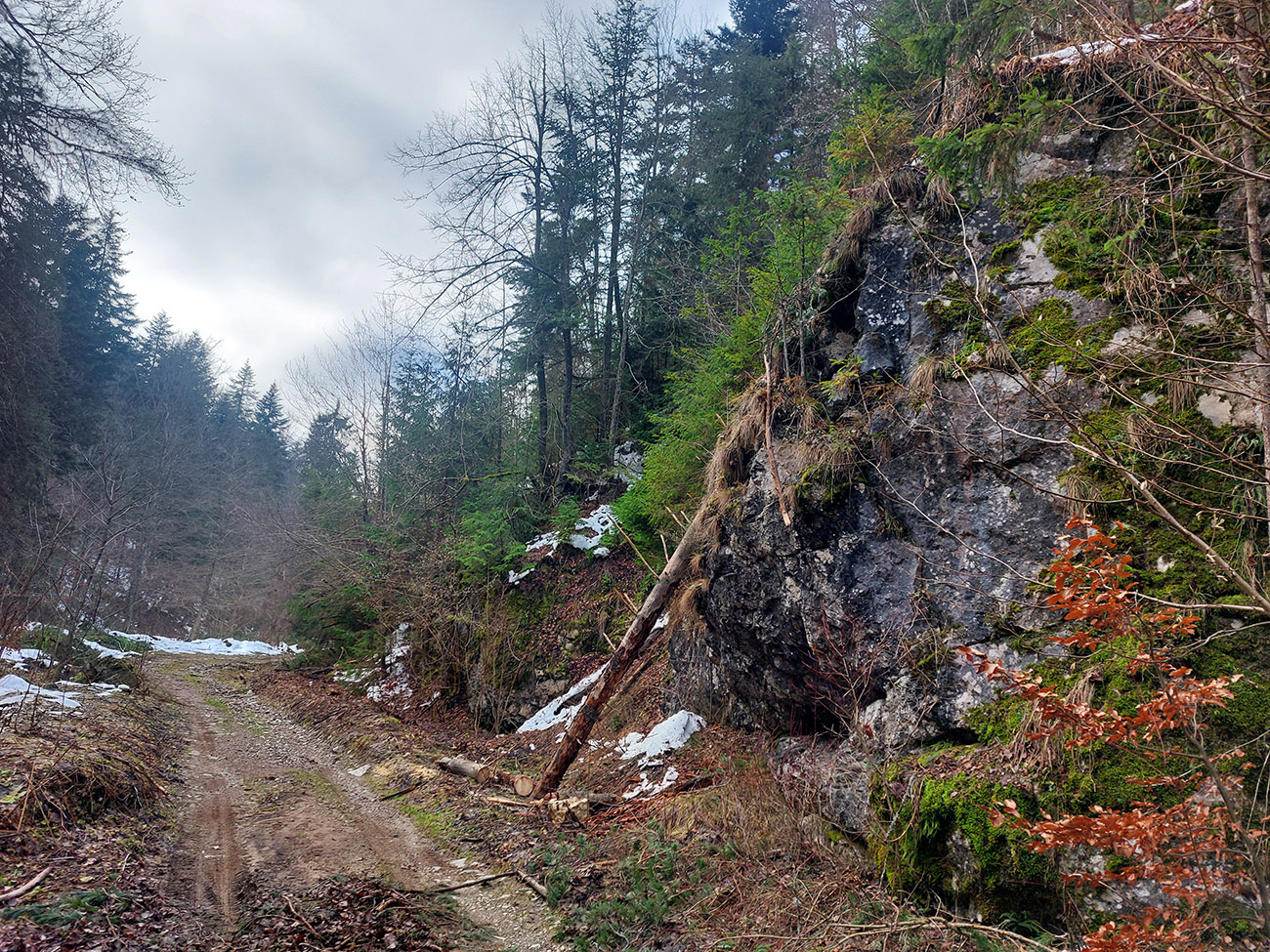 Dolinou vedie starý asfalt, ktorý sa za chatou Čierny bocian mení na klasickú hlinošotolinu, prelieza potok (ale mostík tam je) a tie bralá občas naokolo aj vidieť, heeej. Inak ako všade, aj tu boli ešte časté stopy vyčíňania počasia, ktoré koncom novembra lámalo stromy. Na fotkách vidno.
