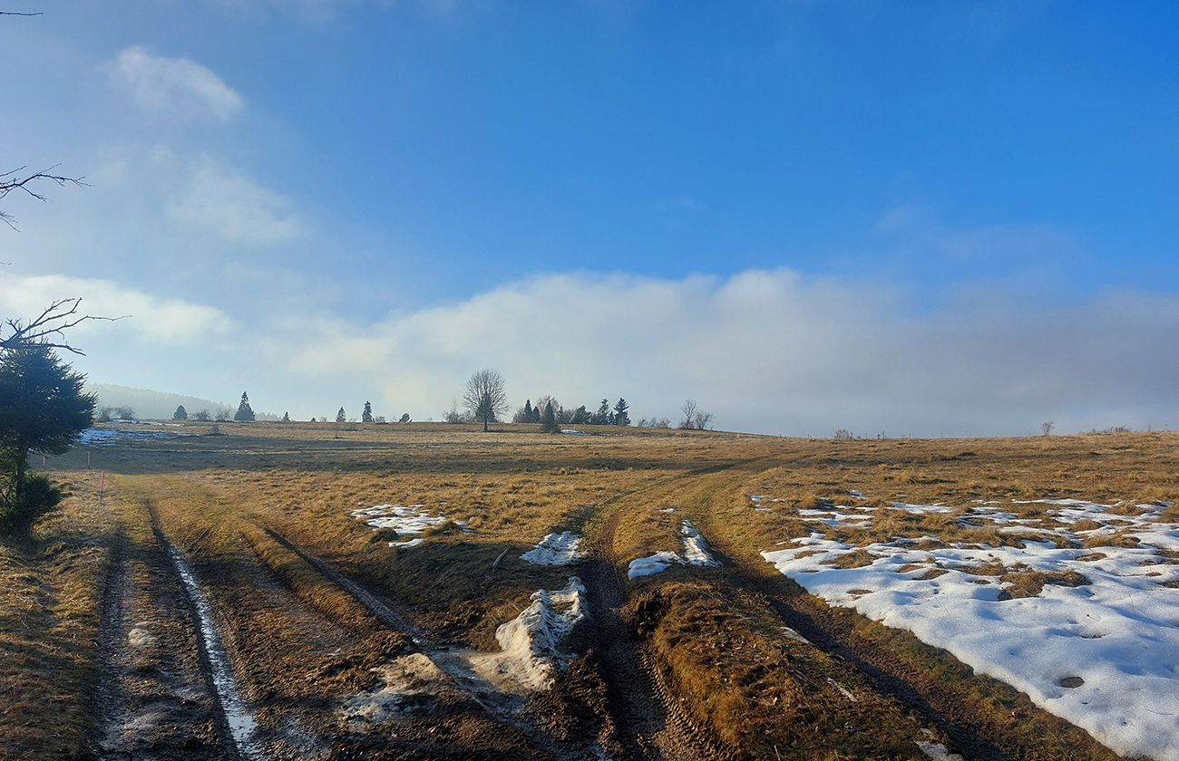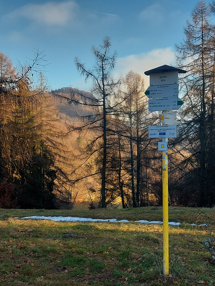 Výplaz po žltej z dna doliny hore pod Suchinec, na „hrebeňové“ lúky, veru nič moc - klasická zvážnica, bordel pod nohami a rúbane naokolo. Ale aspoň sa hmla potrhala a slnko na chvíľu zafarbilo krajinu.