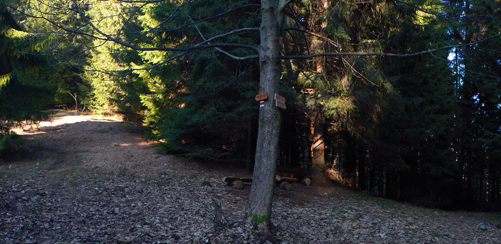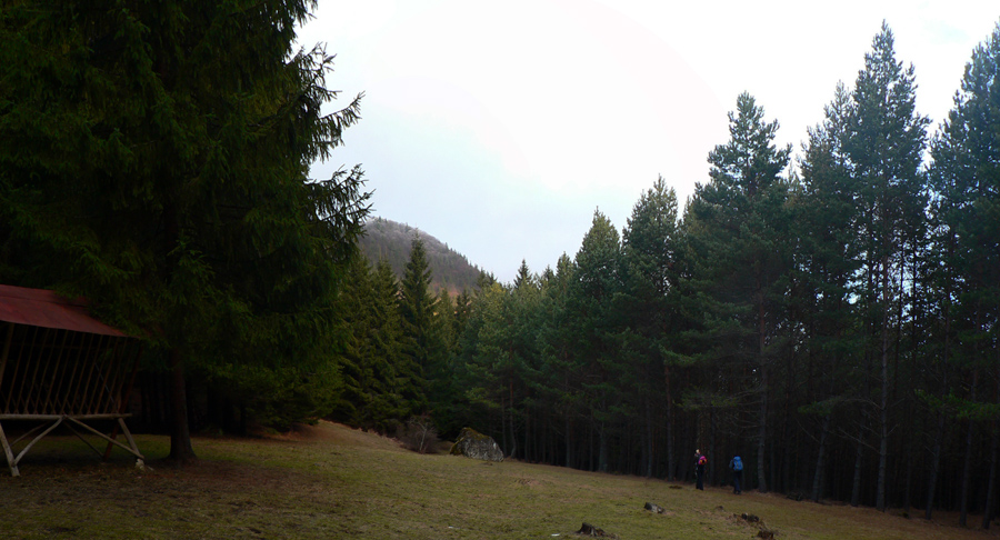 Potom ale už príjemné naberanie výšky popod borovice a smreky, napájame sa na modrú z Likavky a cez peknú lúku s krmelcom a krátke prudké stúpanie sa dostávame do sedla Spuštiak. Povegetíme pár stoviek metrov po zvážnici a znovu začíname naberať výšku po lesnom chodníku. Okolo nás to začína byť pocukrované, akoby tadeto ujo Mrázik prebehol. Aj na zemi pribúdajú zvyšky snehu.