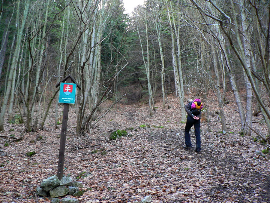 Deň je krátky, preto vyrážame z Liskovej ešte za hlbokej tmy. No už nad dedinou sa pomaly brieždi a okraj lesa triafame bez pochybností, aj keď na poľných cestách značenie nie je ktovieaké. Aj preto asi vstup do lesa označuje „megaznačka“ (najmenej 30x30cm), nakreslená na skale. Ešte trocha špekulácií si užívame okolo chatiek, vyššie pod lesom: chodník vedie cez kroviny a staré medze a žltú treba hľadať.