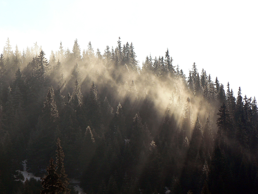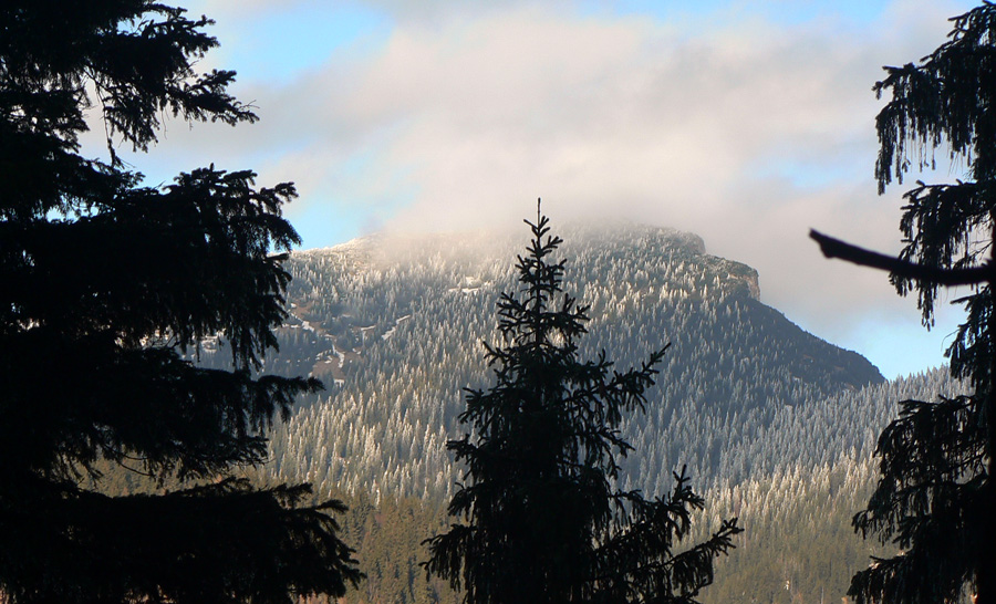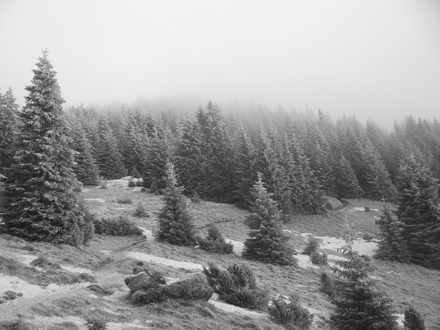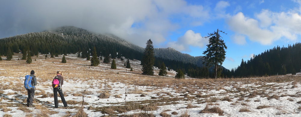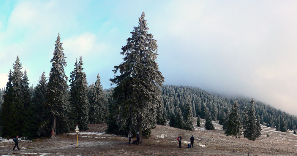 Stredná poľana s „horským hotelom“ je tesne pod mrakmi, ale pohľad na západ sľubuje postupné vyjasňovanie. Len či sa to potrhá aj na vrchole? Tam je zatiaľ mlieko, priam plnotučné. Smerom hore sa trúsia skupinky ľudí, je ich tu celkom dosť, väčšina prichádza z oravskej strany. Stúpame tiež, po zelenej - je to nepríjemné, lebo to minimum snehu na zemi je vyšmýkané a zamrznuté, na tom nový milimetrový poprašok, ktorý situáciu pod nohami ešte viac komplikuje.