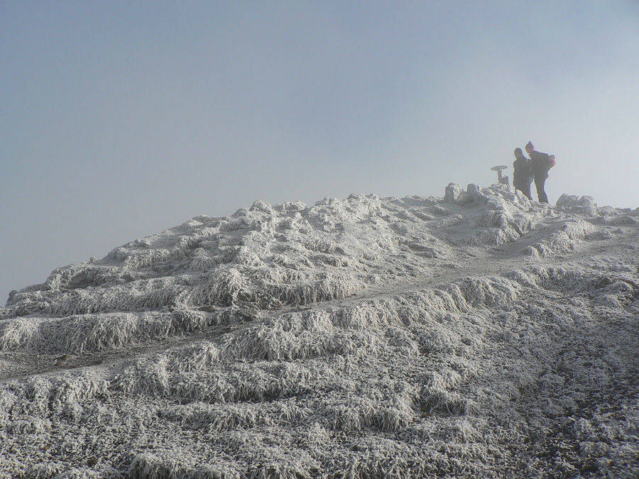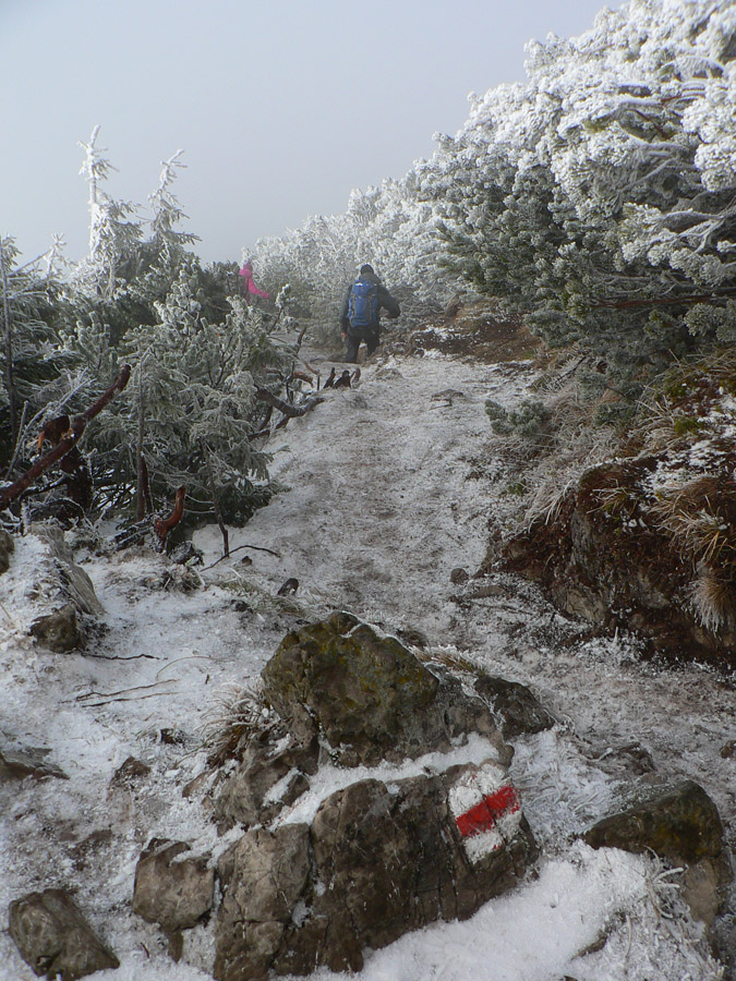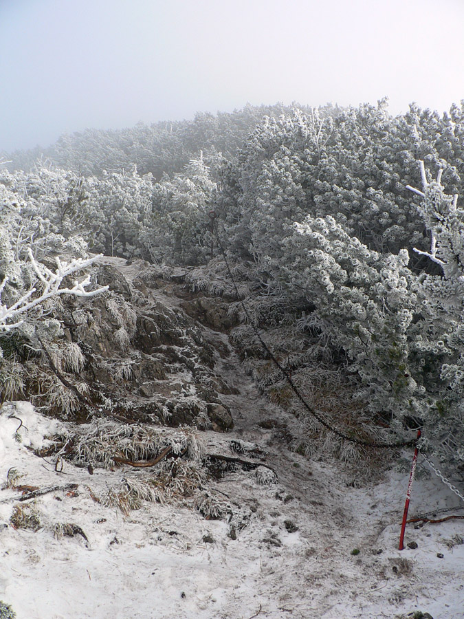Všetko okolo je obalené námrazou a hmlou. Sem – tam sa síce ukáže kus modrej a na vrchole to aj chvíľu vyzerá, že by sa to mohlo potrhať, ale čakáme nadarmo. Takže odchádzame – tento raz po zimnej trase, skúsiť či sa na nej nebude menej šmýkať. A je to ozaj lepšie, aj ľudí je tu viac. Na najstrmších úsekoch pomôžu reťaze. Z mraku vyliezame vyššie, ako sme sa doň vnorili pri výstupe, ozaj to ustupuje. Škoda len, že sme tu boli tak skoro, ale vlaky nečakajú...