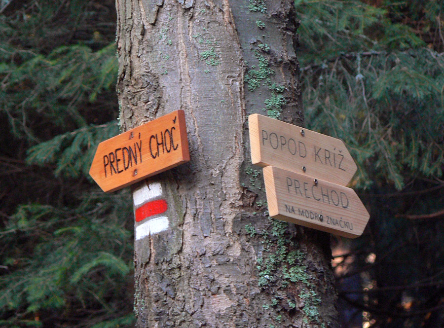 Otvárajú sa nám pohľady na Kubín a všetky Fatry na západe, dole na poľane aj dvere do „hotela“, ktorý už zíva prázdnom. Len údený smrad a bordel ostali po posledných nocľažníkoch. Ponárame sa zas do lesa, ktorý už ale prestáva byť pocukrovaný, naopak - začína v ňom pršať. Toto „jarné“ slnko má teda silu! V sedle Spuštiak meníme modrú za červenú a štveráme sa na Predný Choč. Traverz jeho severným svahom je ešte zamrznutý, ale na vyhliadke suchá trávička na posedenie a aprílová pohodička na lavičkách. Priviedla nás sem odbočka z chodníka, značená pomerne novými drevenými šípkami. Aj tu sú okrem nás ďalší ľudia. Chvíľu čumíme proti slnku na zahmlené obrysy kopcov okolo Ružomberka, orientačným bodom je fajčiaci komín celulózky.