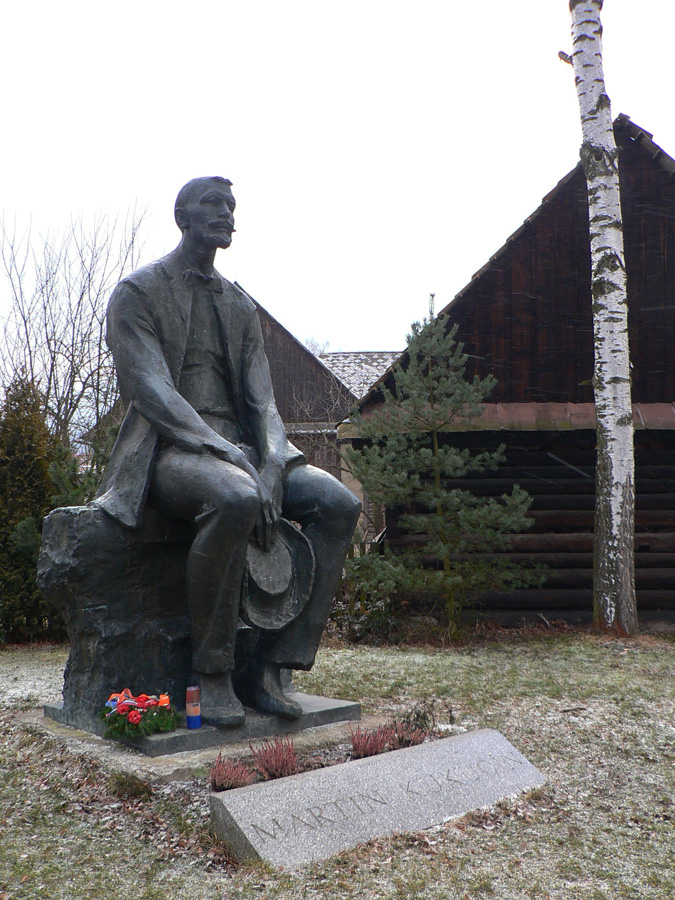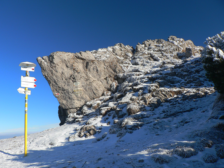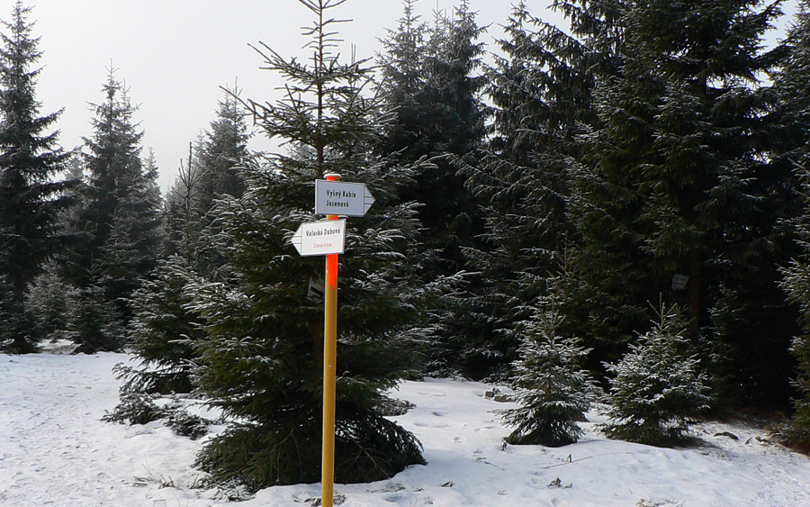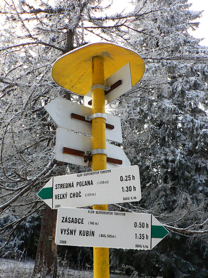 Prvý nápad: skryť sa na chvíľu do dediny, obísť Kukučínovo rodisko sa predsa nesluší! Aspoň trafím dáky smerovník. Ale nič! Keby som nevidel obrys Choča v mraku, netuším kade sa dať. Až nad dedinou pri ceste vyblednutá červená na drevenom smerovníku, ktorý udáva aj smer - ale do najbližšej reštaurácie. Tak stúpam opačným smerom po starej panelke, značky nikde. Smer je zatiaľ síce jasný, ale predsa len, nie každý sa tu vyzná...