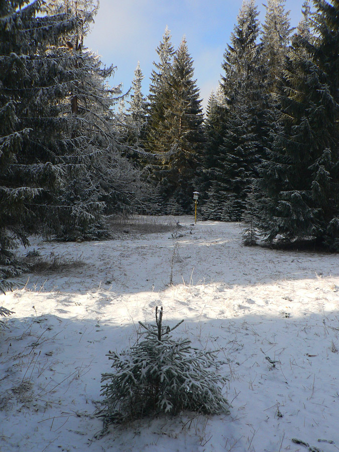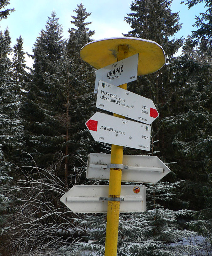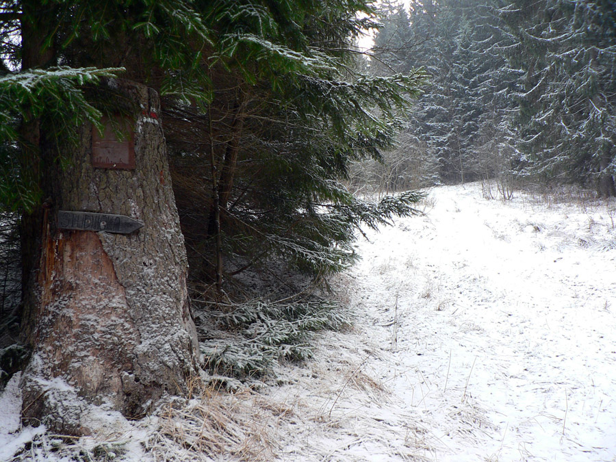 V lese už lepšie „označkovanô“. Po pol hodinke stúpania, na okraji lúky, zrazu smerovník! Jediná tabuľka ukazuje nazad do dediny: hodinu desať! Ej, to som musel dobrú skratku trafiť :-) Konečne to začína byť strmšie, konečne sa ohrejem :-) Až po Drapáč (križovatka so zelenou) je to striedavo strmo, mierne, strmo, mierne - širokým chodníkom a pekným lesom, už som v NPR. Cestou aj studnička, volá sa Lucka :-) Ale moc nenapojí, jedine z jazierka pod ňou.