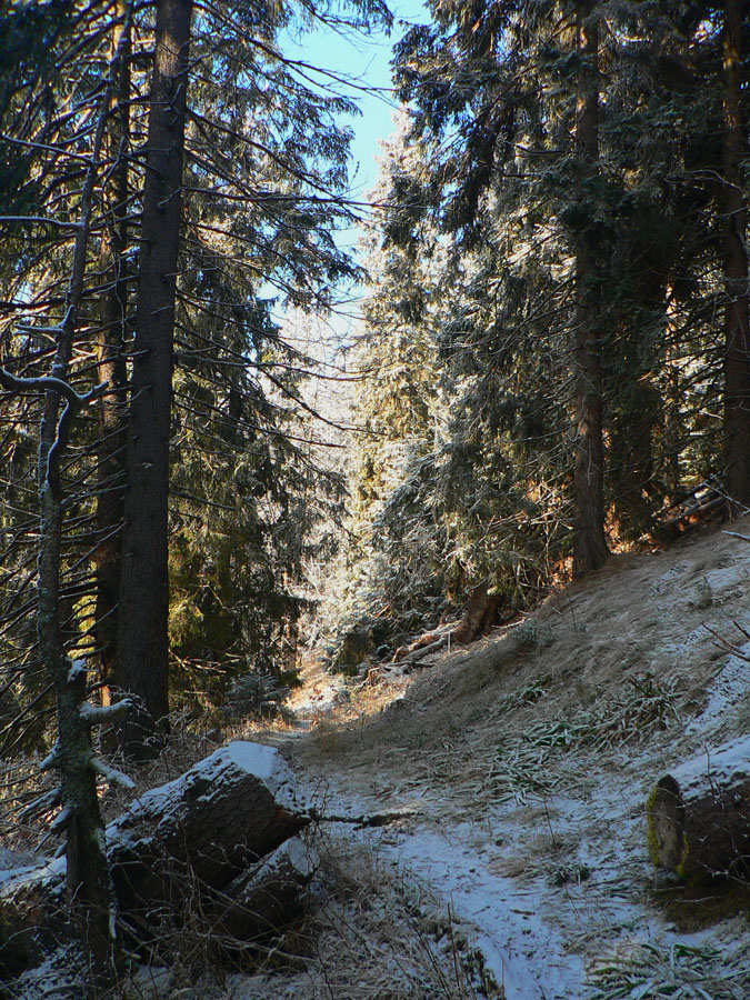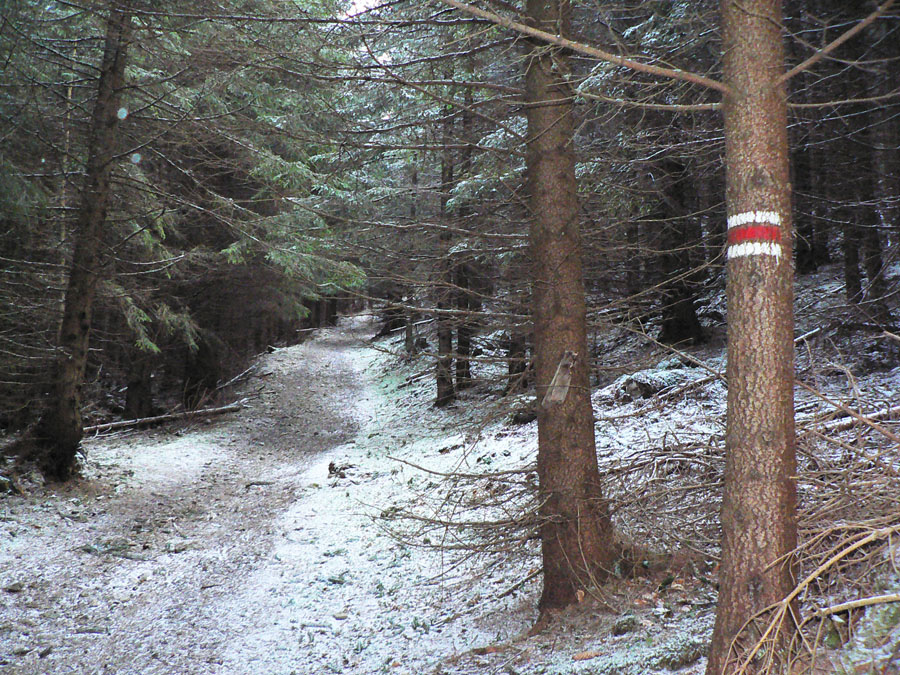 Smerom dole volím zelenú, nešmýka sa na nej tak ako na červenej zimnej. Dolu na poľane okolo „hotela“ už ničota naťahuje chápadlá, v traverze k smerovníku na Drapáči ale stále presvitá slnko do chrbta a ešte viac skrášľuje pestrý starý les.