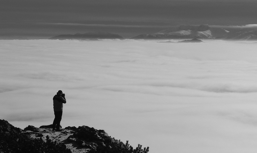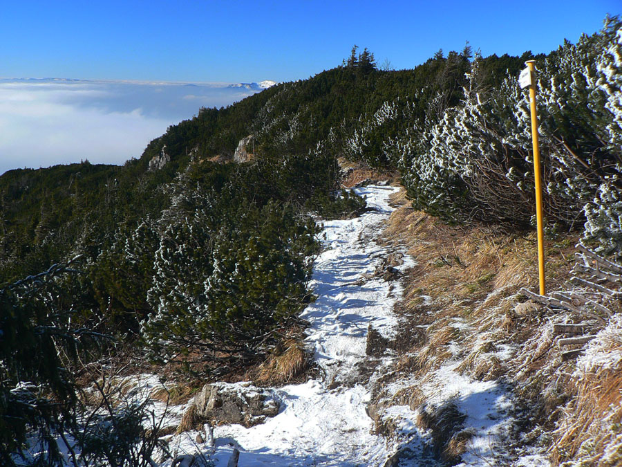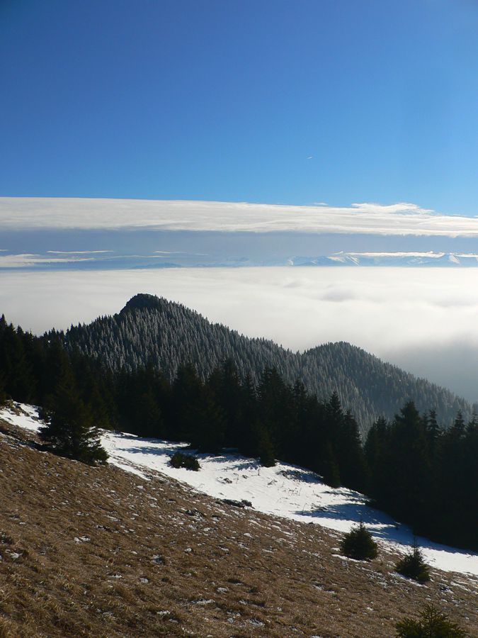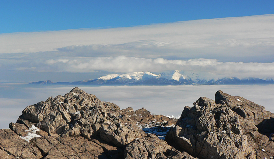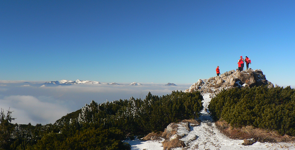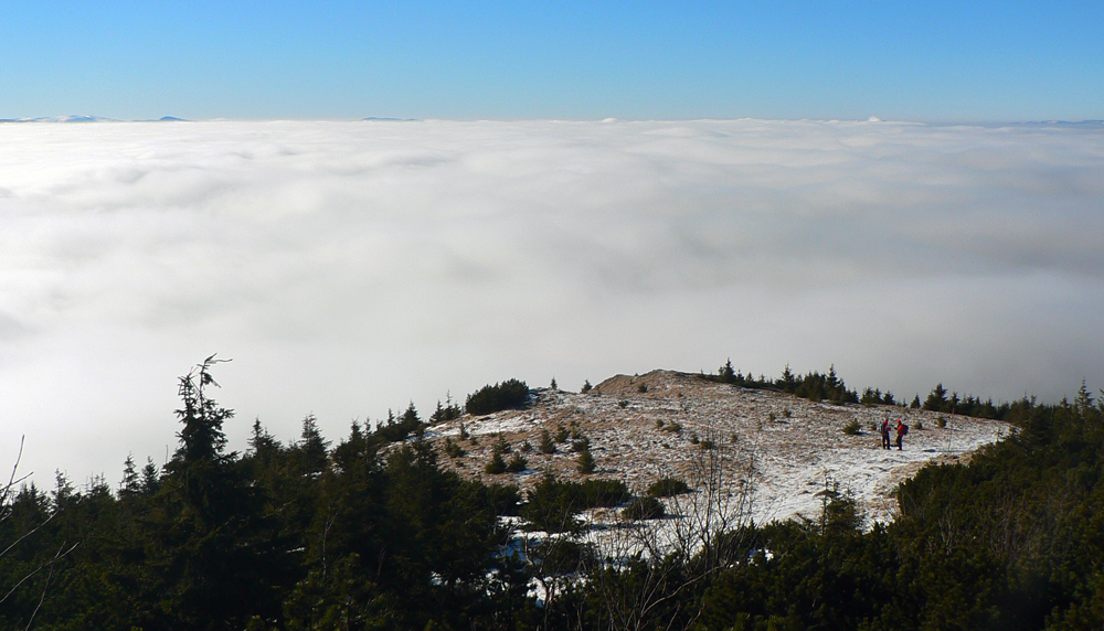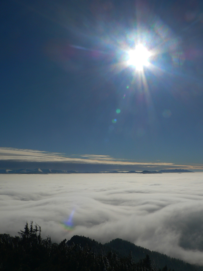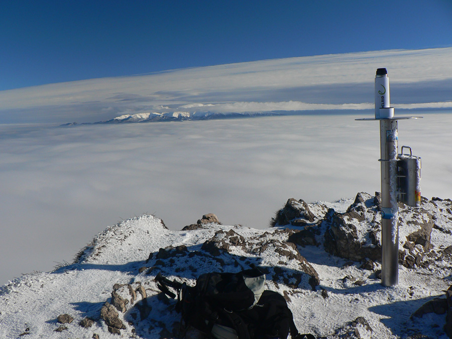 Ešte zo 40 minút, trocha šaškovania na klzkých kameňoch v strmáčiku s reťazami, trocha fotenia „mordoru“ a fatranských súostroví v diaľke a som hore - v slnku, bezvetrí (!!!), každý kto príde hore povie „jeeeeeeeeeeeeej“ a tasí foťák a rožky so salámou :-) Tak toto som nečakal, zdola to vyzeralo, že mraky ležia na vrcholoch kopcov. Pritom sa držia len v tenkej vrstve okolo 1000 - 1200m a nad tým azúro.