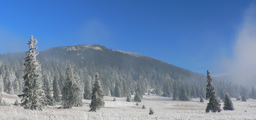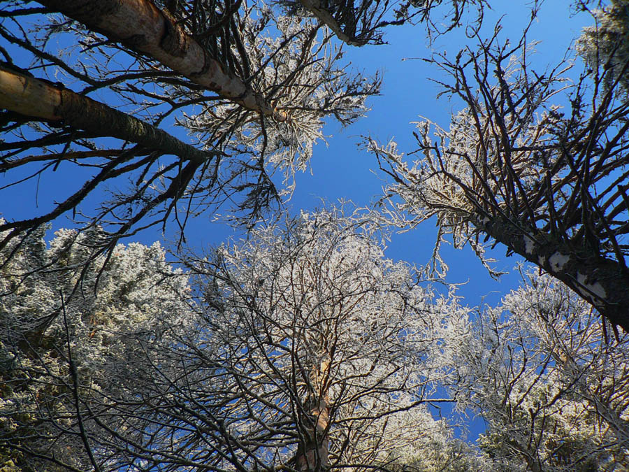 Nad Drapáčom pokračujem po červenej, sklon sa mierni, les redne, o 20 minút som na zimnej ceste zo Strednej poľany na Choč. A div sa svet, mordor a ničota ostáva za mnou, alebo skôr podo mnou: slnko, modro nad hlavou, bielo okolo. To biele je síce viac námraza ako sneh, ale aj to sa ráta v tejto biede. A hlavne: nefúka!