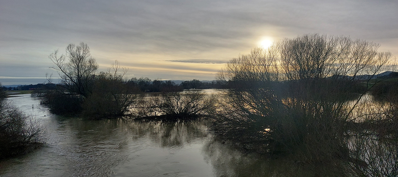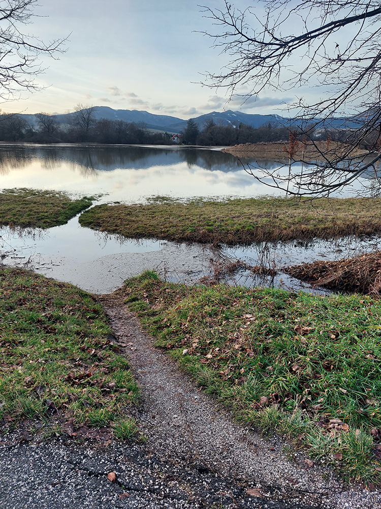 Tak som začal symbolicky v Jazernici, po našom Lake City. Ak nasneží a cestári posolia, bude aj Salt Lake City. Teraz akurát jazerá všade na lúkach okolo dediny. Najskôr teda kúsok na sever: popri odbočke do Blažoviec, ktorá bola ako pekný brod. V Moškovci zas mali miestne kozy ubytovanie priamo na pláži. Okolo nich som to stočil na Laclavú a už som cestou obzeral povylievaný Turiec. CHA Ivančinské močiare sa zmenili na Ivančinské more. Za Veľkým Čepčínom pekný pohľad do zaliatej nivy z nadhľadu riečnej terasy, aj keď z diaľky.